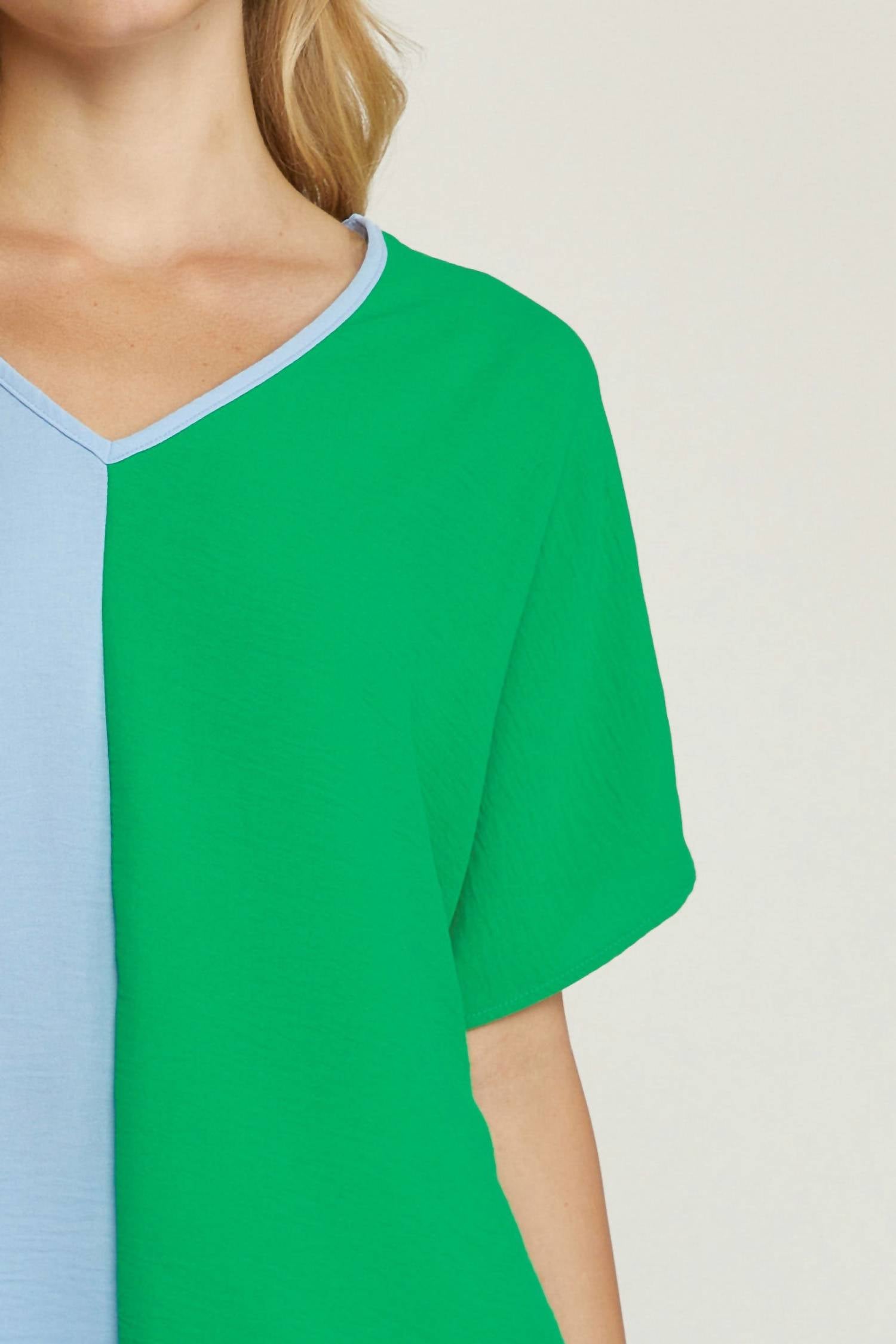 A timeless blouse that will never go out of style. The Color Block V-neck Top by Entro is a chic and comfortable addition to your wardrobe, featuring a trendy mix of green and blue. With short sleeves and an oversized relaxed silhouette, this top is perfect for both work and play. Made from 100% polyester, it's crafted in the USA and offers a pull-on closure. To maintain its vibrant color block design, hand wash or opt for dry cleaning. Available in sizes ranging from Small to 2X with a length of 25" to 31".