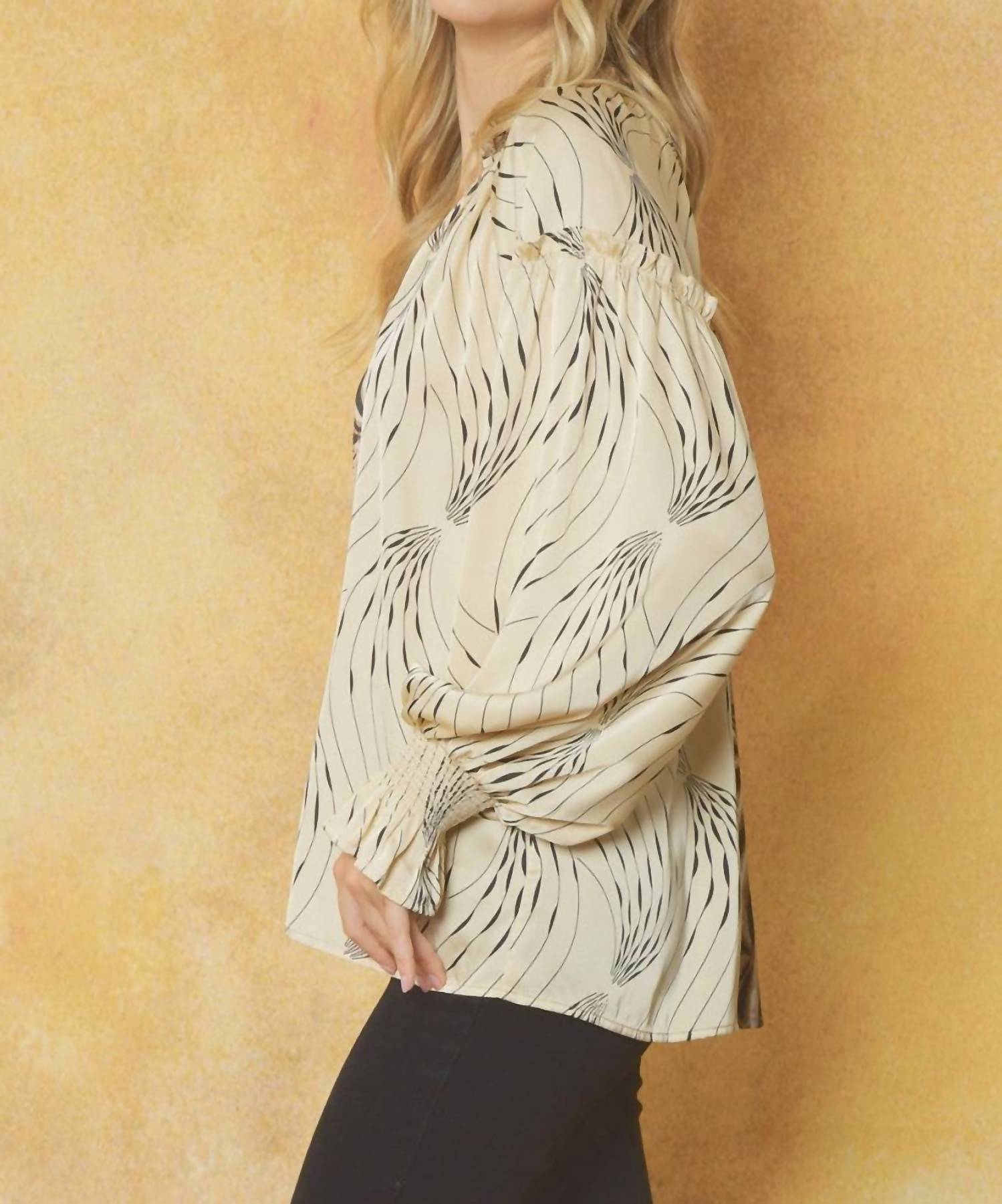 A versatile blouse that works from desk to dinner! Top Has A V-Neckline Featuring Covered Button Front Closure. Blouse Has Long Sleeves With Smocked Ruffle Cuffs. Top Is A Loose Fit That Is Unlined, Woven, Non-Sheer And Lightweight. A Blouse That Does Double Duty, Wear To Work During The Day And At Night Pair With Leather Or Black Denim. Fabric: 100% Polyester. Model Is 5'10" And Wearing Size Small.