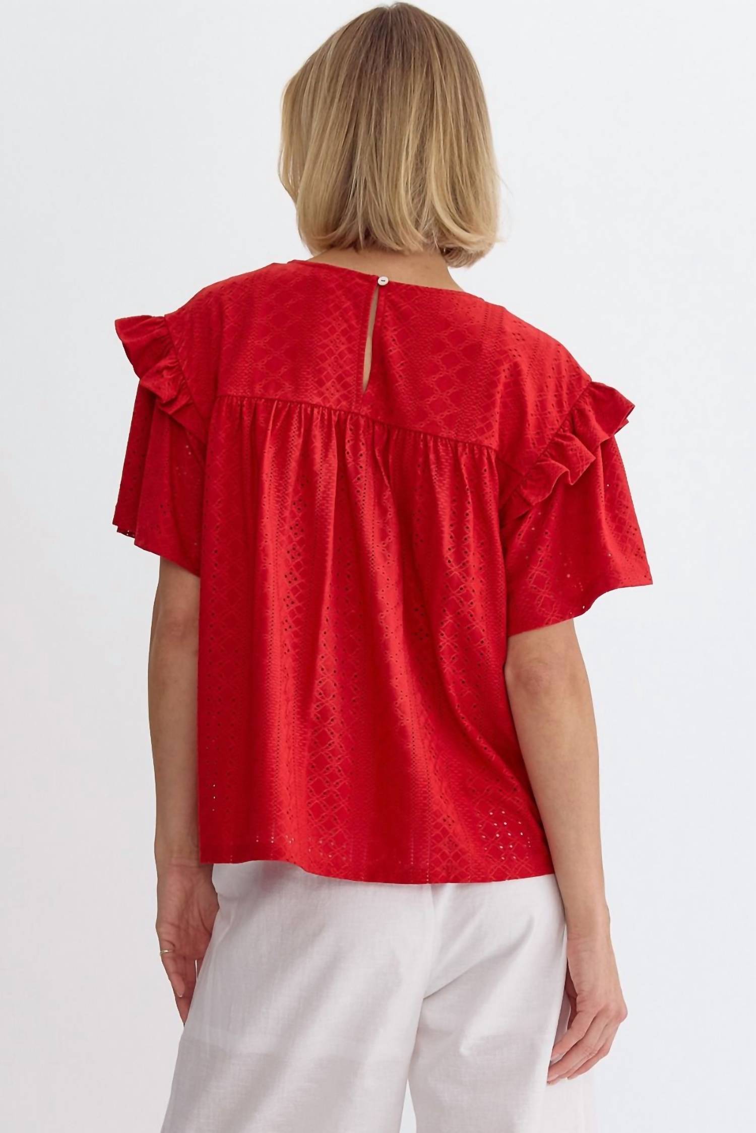 This classic, short sleeve tee will be your go-to staple this season and beyond. Charming textured, short sleeves and ruffle detail at the shoulders. Crafted in a lightweight, non-sheer, and woven fabric. Offers a relaxed fit. Back features a convenient button closure for easy dressing.