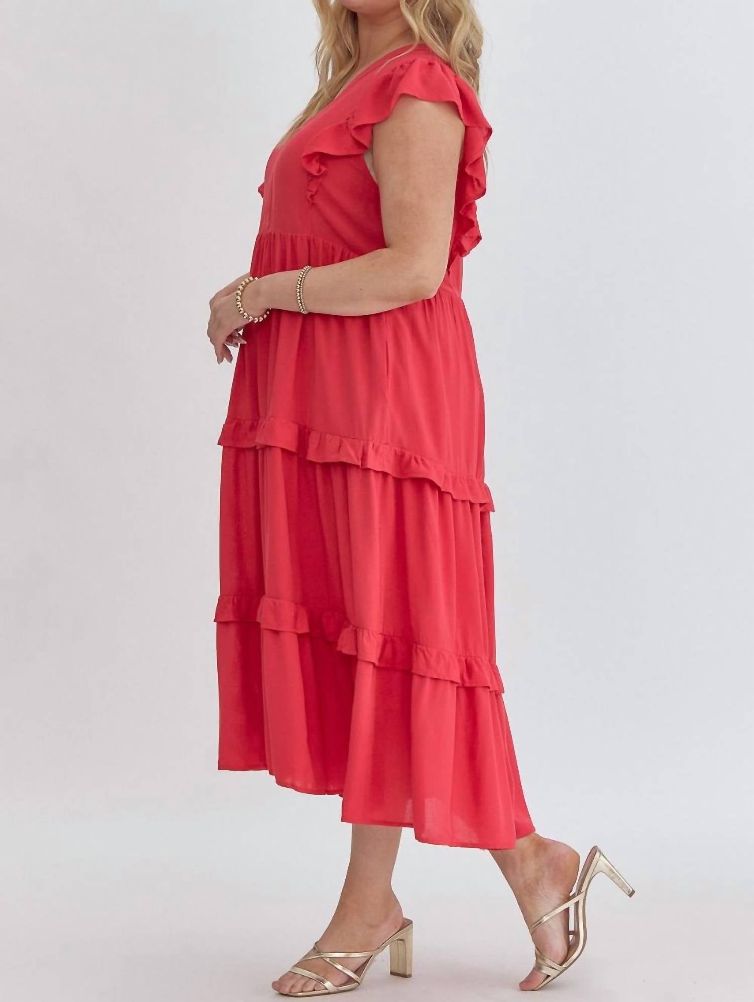 A midi dress so versatile, your options for wearing it are endless. Introducing the Curvy Karli Ruffle Sleeve Tiered Dress by Entro, a charming piece perfect for any occasion. This women's shift dress, crafted from 100% Rayon, features short ruffled sleeves and a playful stripe pattern. Designed with a flattering V-neckline and comfortable pull-on closure, it's ideal for a minimalist spring look or a vacation getaway. Practical with handy pockets, it comes in plus sizes XL to 2X, featuring a bust measurement of 42" to 46". Care: Machine wash.