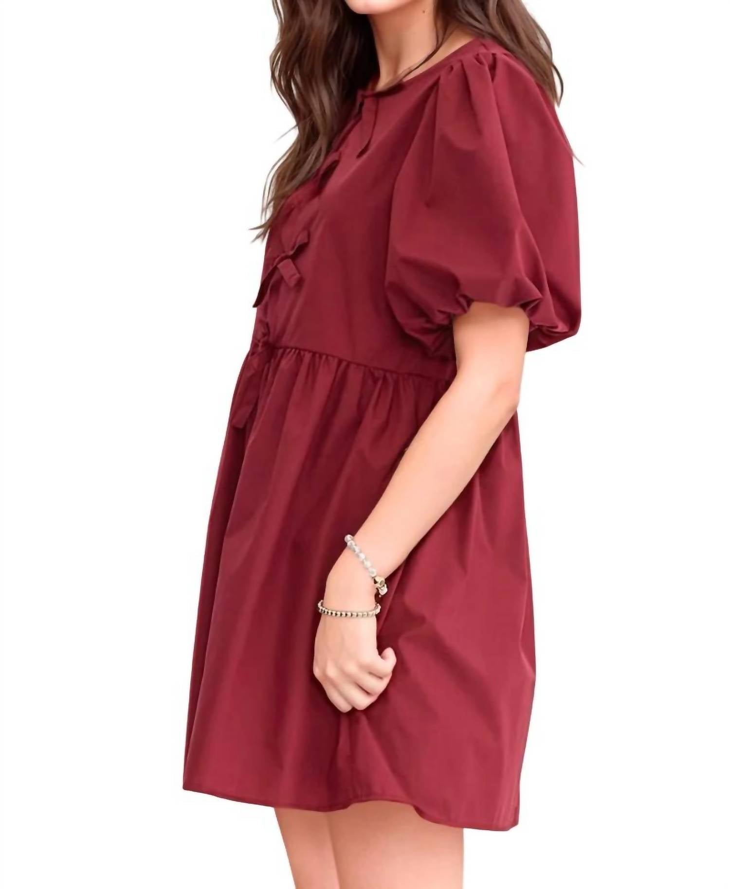 A short and breezy dress for those warmer days. Elevate your wardrobe with the Dalila Puff Sleeves Bow Detail Mini Dress by Entro in stunning garnet. This women's A-line dress features short puff sleeves and a charming tie closure with bow detail, crafted from 80% polyester and 20% cotton for a lightweight feel. Imported and fully lined, it offers practicality with side pockets and a classic solid pattern. Care instructions recommend hand washing and line drying to maintain its coquette style.