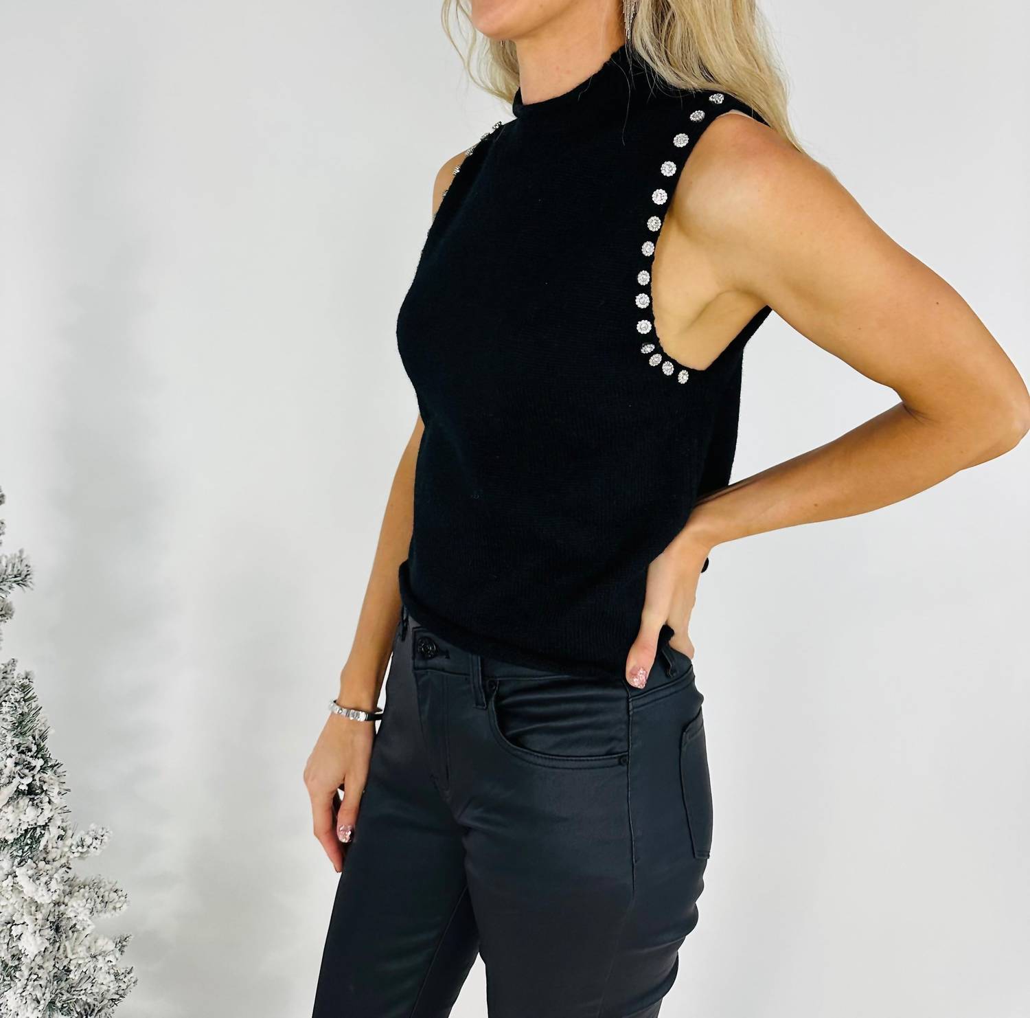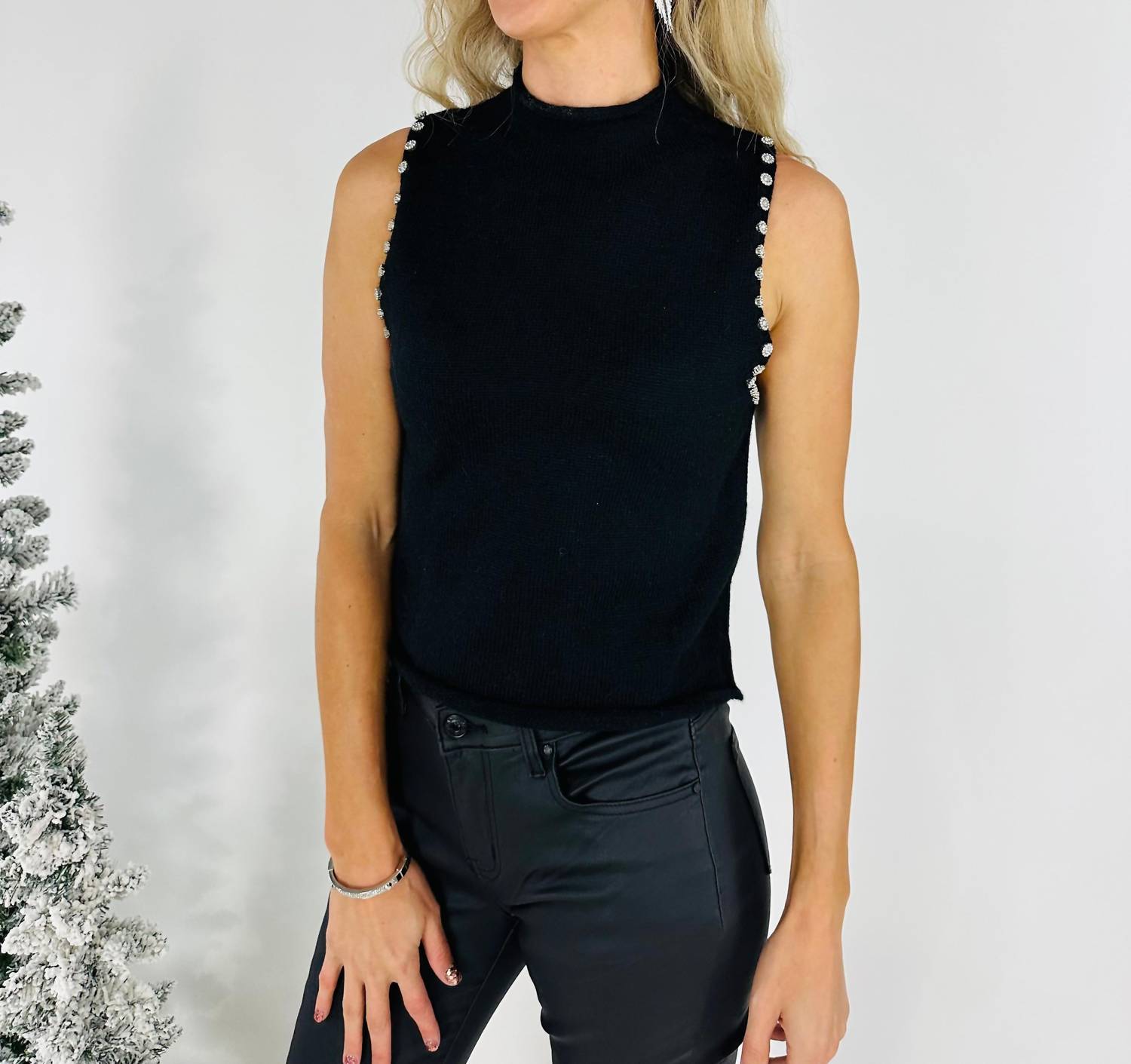 Introducing the Dani Rhinestone Gem Top by Entro, a must-have for elevating your holiday party ensemble with a touch of quiet luxury. This sleeveless, solid black blouse is crafted from lightweight, 100% polyester, ensuring a comfortable fit while exuding elegance. The mockneck and pull-on closure provide a sleek silhouette without the fuss of buttons or zippers. While care instructions are not specified, this trendy piece is perfect for celebrating New Year's Eve in style.