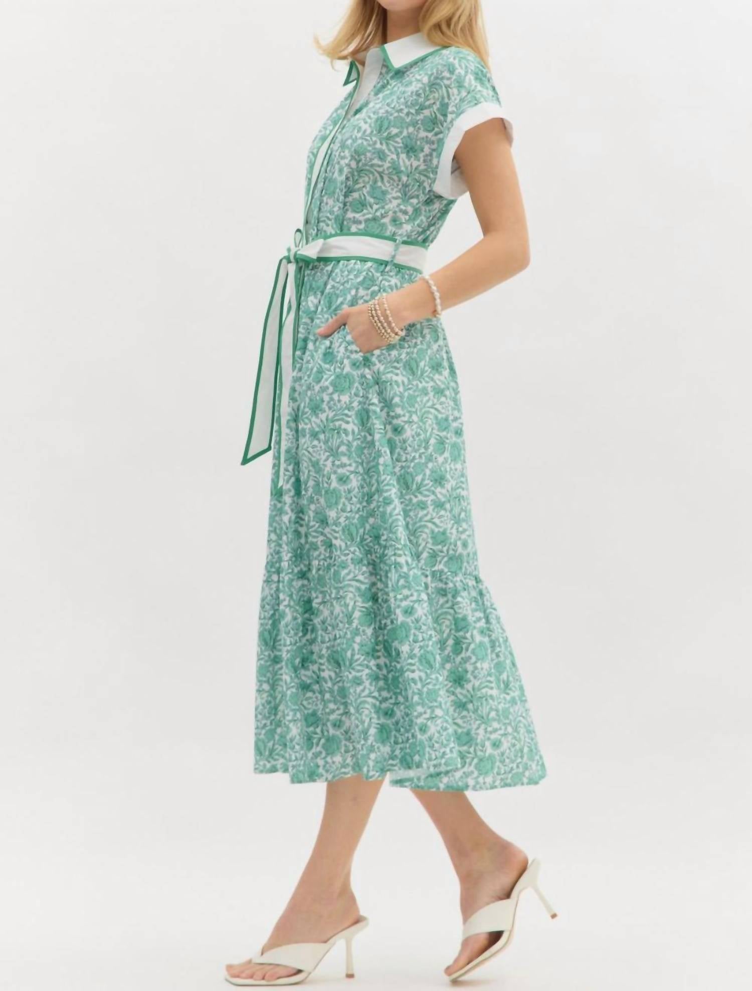 The perfect length dress does exist. Elevate your summer wardrobe with the Delicate Blooms Floral Midi Dress by Entro, showcasing cap sleeves and crafted from 100% cotton for breathable comfort. This green, patterned dress features a stylish shirt silhouette with an accented collar and convenient side pockets. The button closure and removable belt add tailored sophistication, while contrast binding and an inset finish complete the boho chic look. Perfect for a beach day or even Thanksgiving, this dress embodies effortless elegance.