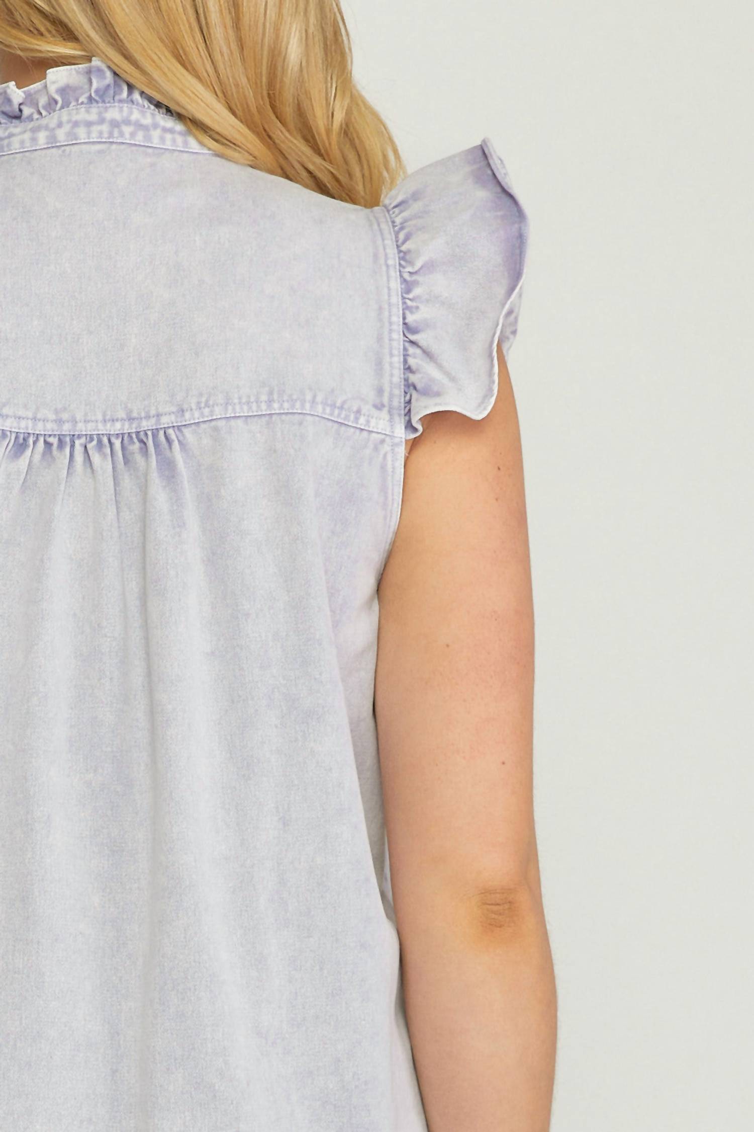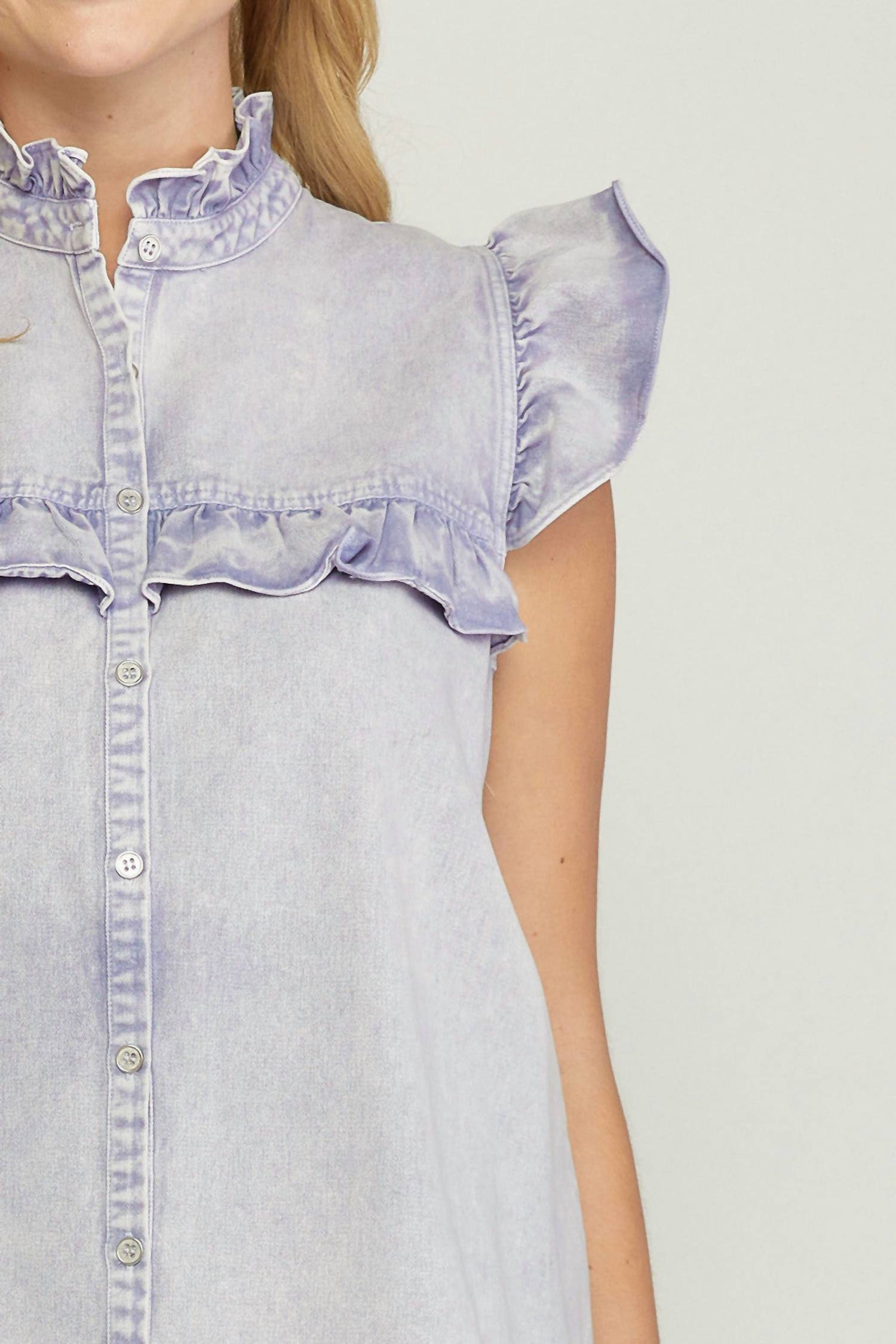 Look no further, you just found your perfect tee! The Entro Denim Ruffled Top in Peri is a must-have, blending trend and comfort effortlessly. This women's top features stylish cap sleeves and a crewneck, detailed with a ruffle neckline and flutter sleeve design. Crafted from a blend of 65% Cotton, 32% Polyester, and 3% Spandex, it's both lightweight and allows for easy movement, thanks to its stone-washed, a-line silhouette with an elegant button closure. Care for this solid patterned piece with hand washing or dry cleaning to maintain its quality. Available in various sizes: Small (Bust 36", Length 25"), Medium (Bust 38", Length 25"), Large (Bust 40", Length 25"), XL (Bust 48", Length 29"), 1X (Bust 50", Length 29"), and 2X (Bust 52", Length 29").
