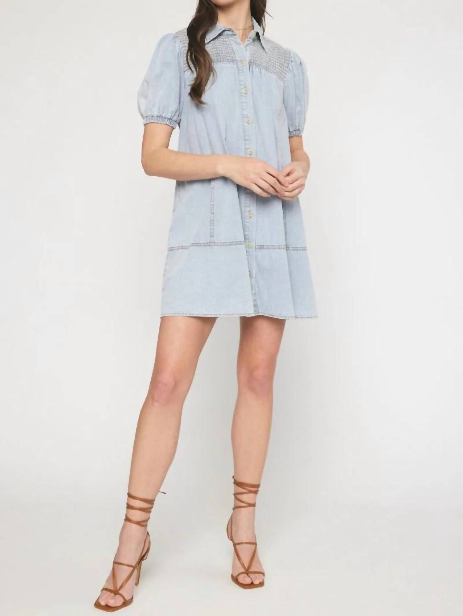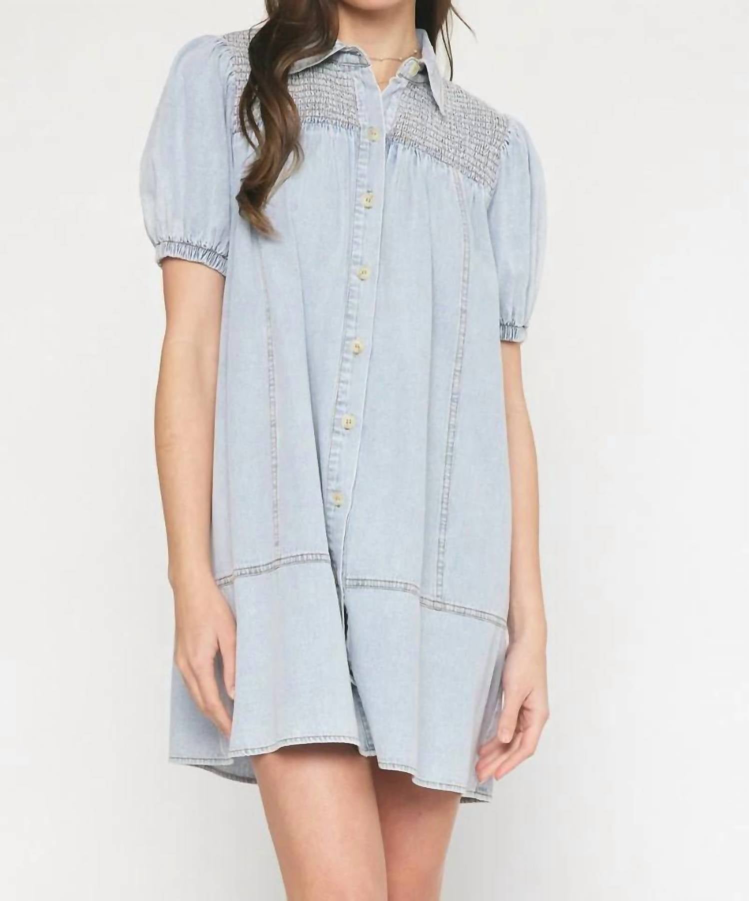The kind of easy and flattering dress you'll be reaching for all season long. Introducing the Denim Smocked Dress by Entro, a vintage-inspired piece perfect for summer vacations. This light blue mini dress features short sleeves and a collared neckline, combining classic style with modern ease. Made from lightweight, non-sheer denim, it includes smocking details at the shoulders for a unique touch. The button closure ensures a secure fit, and it is easy to care for with machine wash instructions.