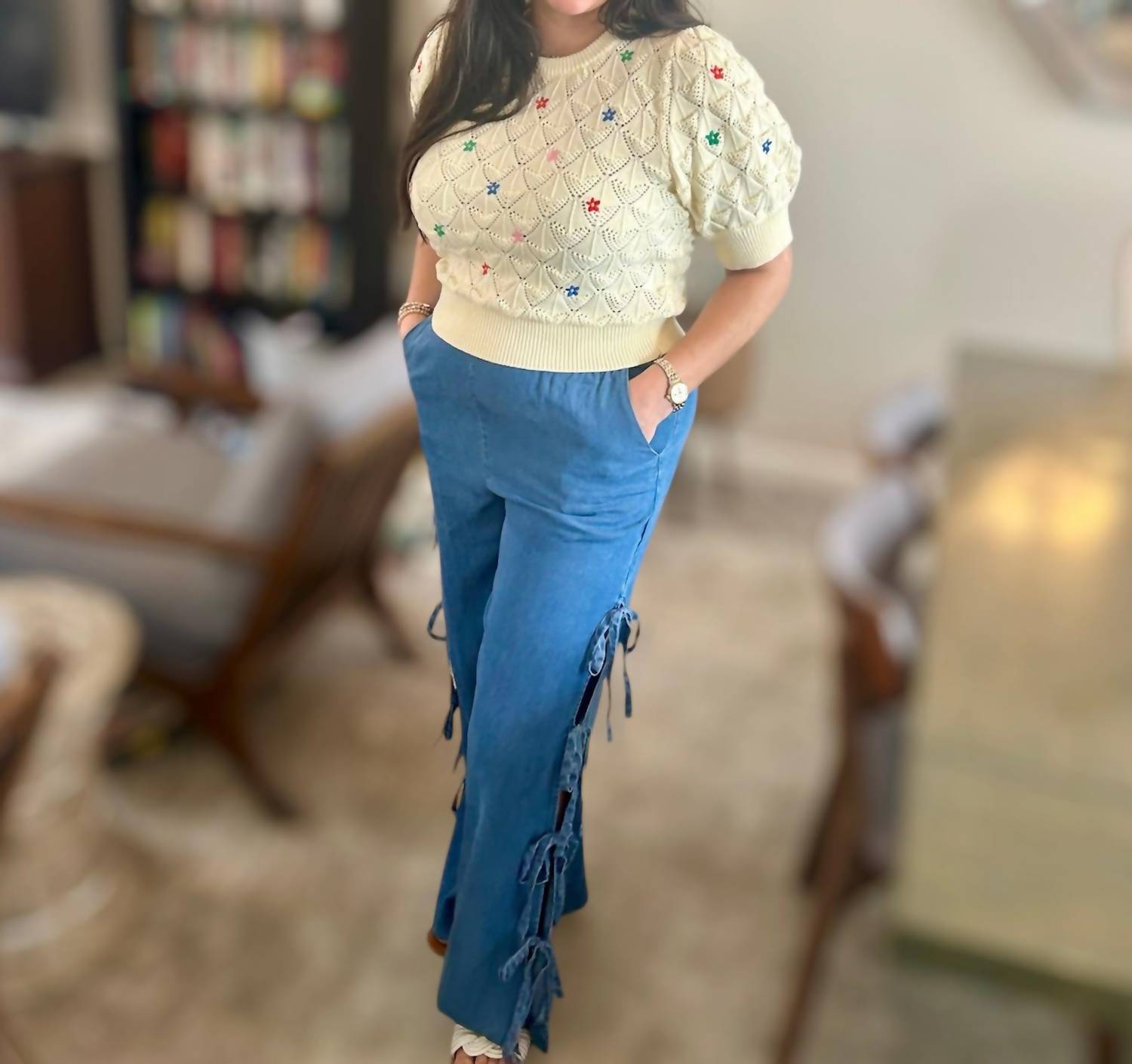 Stay warm and stylish in this versatile and effortlessly cool knitwear staple. Wear it alone or layered, it's the perfect sweater for the season and you'll wish you had it in every color. The Diamond Pattern Pointelle Sweater by Entro is an elegant, beige pullover top perfect for the fall season. Highlighting short puff sleeves and floral embroidery, this piece combines a textured, semi-sheer knit with 100% cotton for a lightweight feel. It features a crewneck design and provides convenient pull-on closure. For care, machine wash and lay flat to dry. Available with bust measurements: small 36", medium 38", large 40", and lengths: small 20", medium 20.5", large 21".