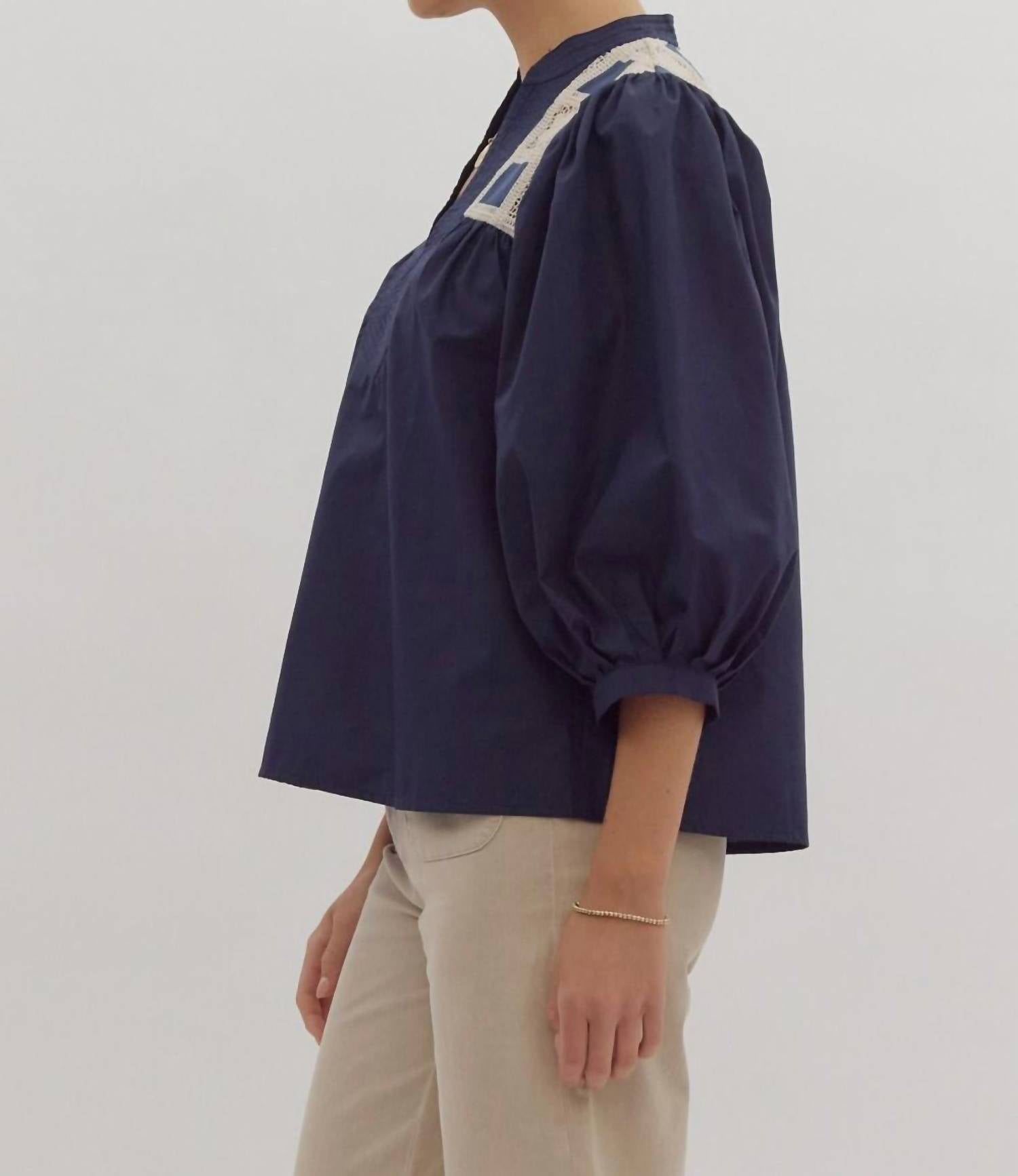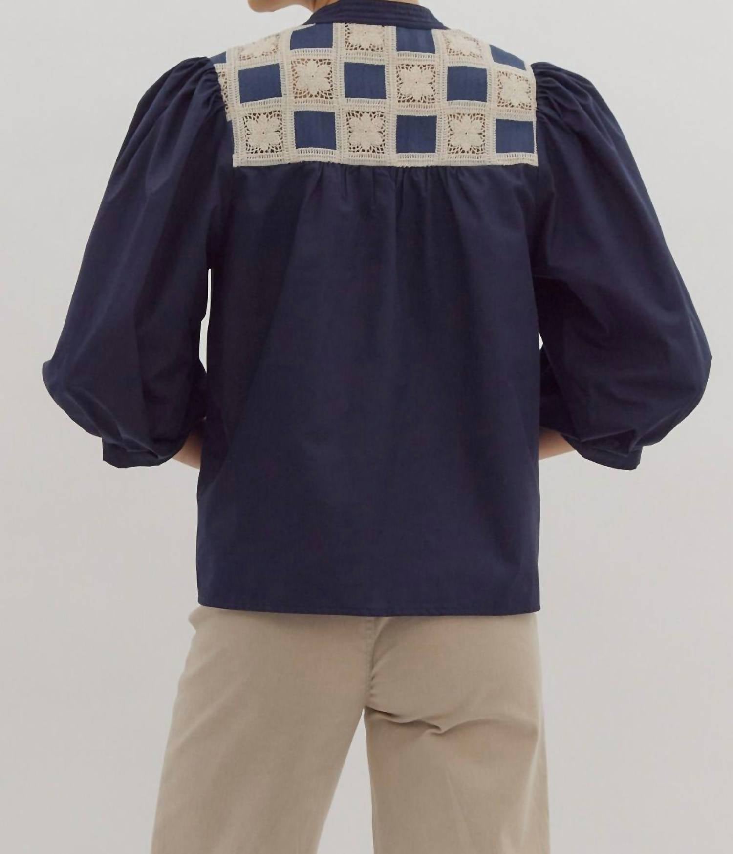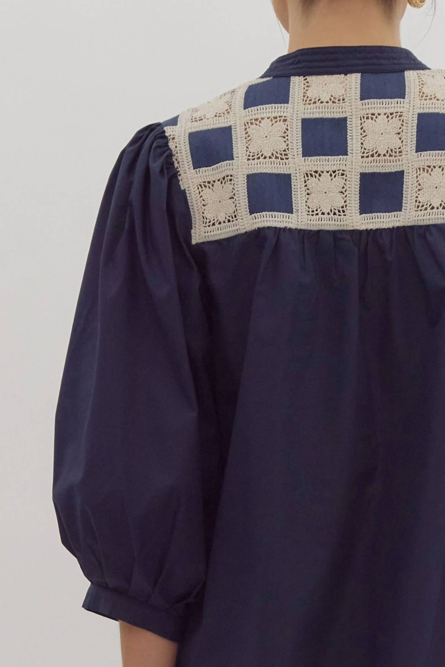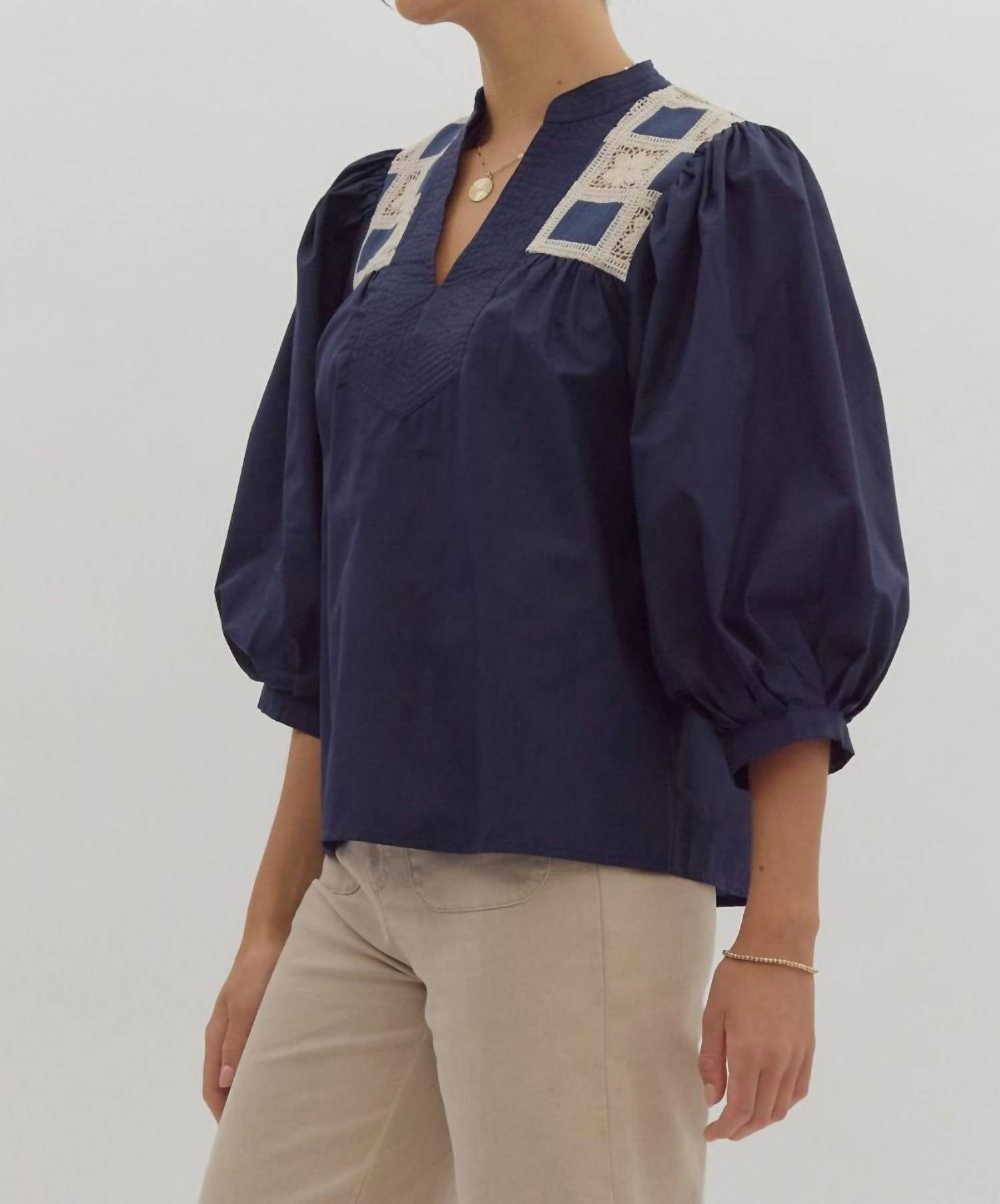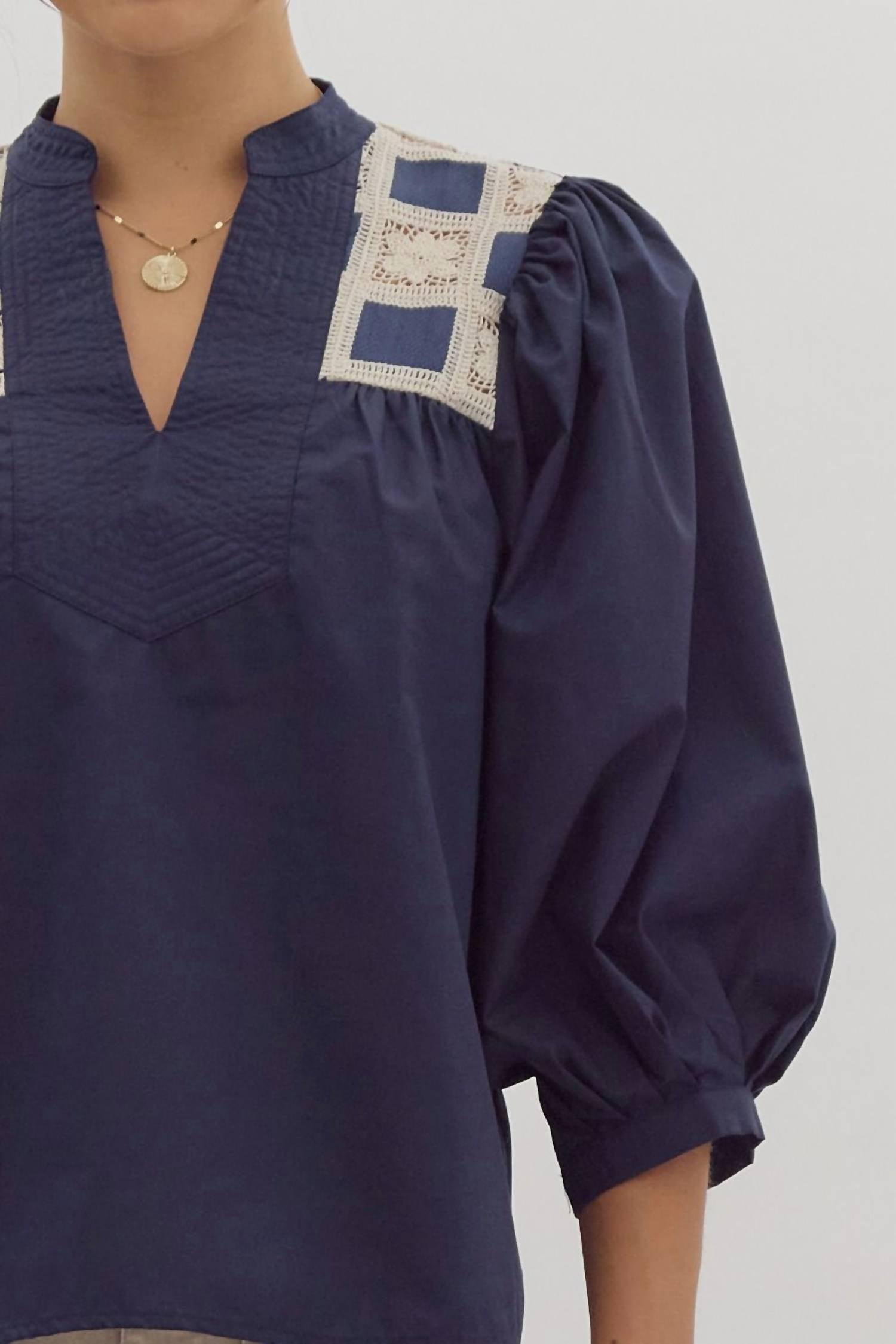 A versatile blouse that works from desk to dinner! Versatile navy top. Features elegant three-quarter sleeves and a charming V-neck adorned with crochet lace detail. Designed with a lightweight, woven material. Unlined and non-sheer. Promises comfort and style. Machine washability.