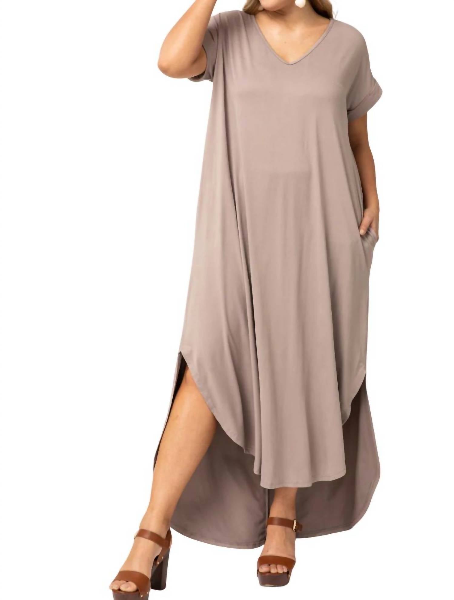 Discover relaxed elegance with the Everyday Pocket Maxi Dress by Entro, a must-have for your wardrobe in the refreshing Shitake color. This short-sleeved dress features a V-neckline, an A-line silhouette, and is crafted from 94% polyester and 6% spandex, ensuring a soft and lightweight feel. With practical side seam pockets and a high-low scoop hemline, this dress has a length of 51" for sizes Small through Large, and 55" for XL to 2X. Made in the USA, it offers a pull-on closure for ease, and is best maintained with hand washing or dry cleaning.