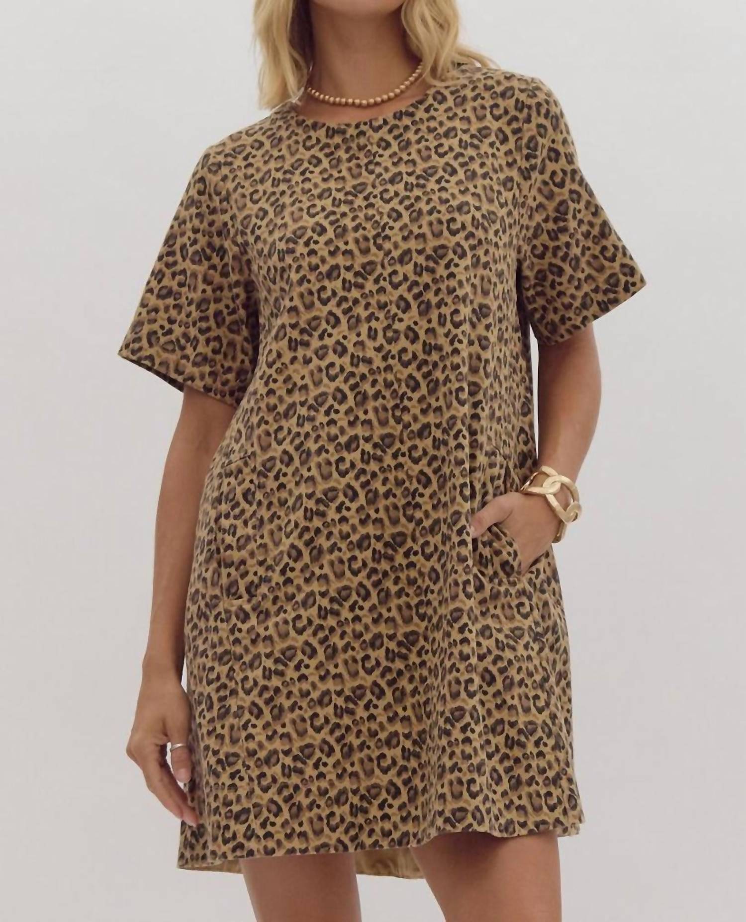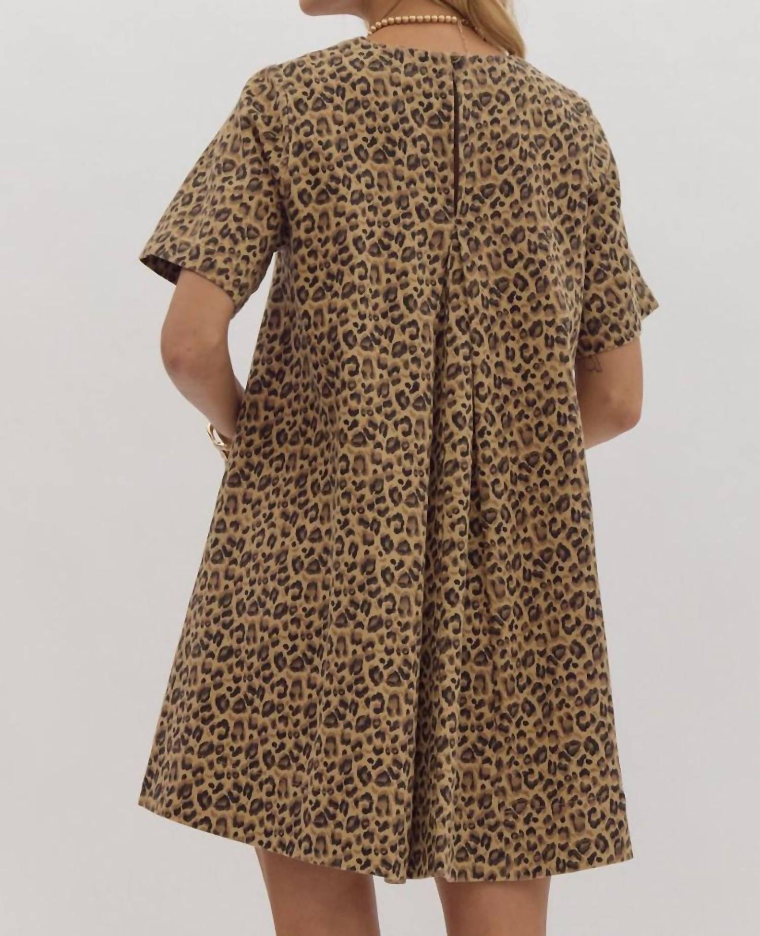 Introducing the Fabulously Wild Leopard Swing Mini Dress by Entro, an eye-catching piece in camel featuring a playful animal print. This comfy dress is crafted from 100% cotton with short sleeves, ensuring breathable wear and ease of movement. Designed with a shift silhouette and functional side pockets, it closes with a simple pull-on style, making it perfect for casual outings or dressed-up occasions. Care for this garment by hand washing, and enjoy its perfect fit at any event. Model Shea is 5’1” and is wearing a size Large.