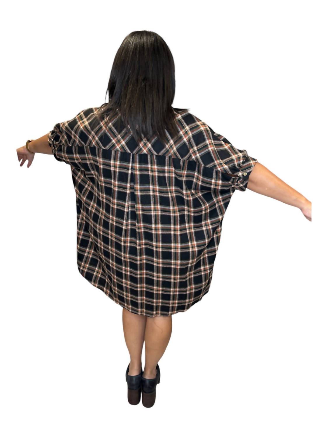 Cozy plaid flannel design perfect for cooler months. Oversized, relaxed fit ideal for layering or wearing solo. 60% Polyester, 40% Cotton.