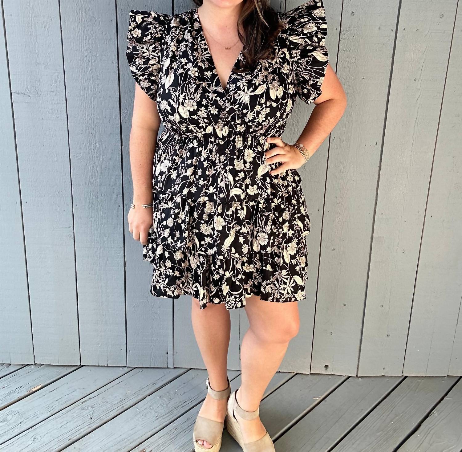 The perfect mini dress for those warmer months. Introducing the Flirty Girl Mini Dress by Entro, a go-to choice for any occasion with its charming design and playful features. This dress boasts short ruffled sleeves and a flattering V-neckline, complemented by a cinched elastic waist for a seamless fit. Crafted from 100% cotton with a fully lined 100% rayon interior, this versatile mini dress in a captivating black and cream floral pattern promises all-day comfort. With a pull-on closure, it requires hand washing and line drying. Model Shea is 5'1" and wears a size L.