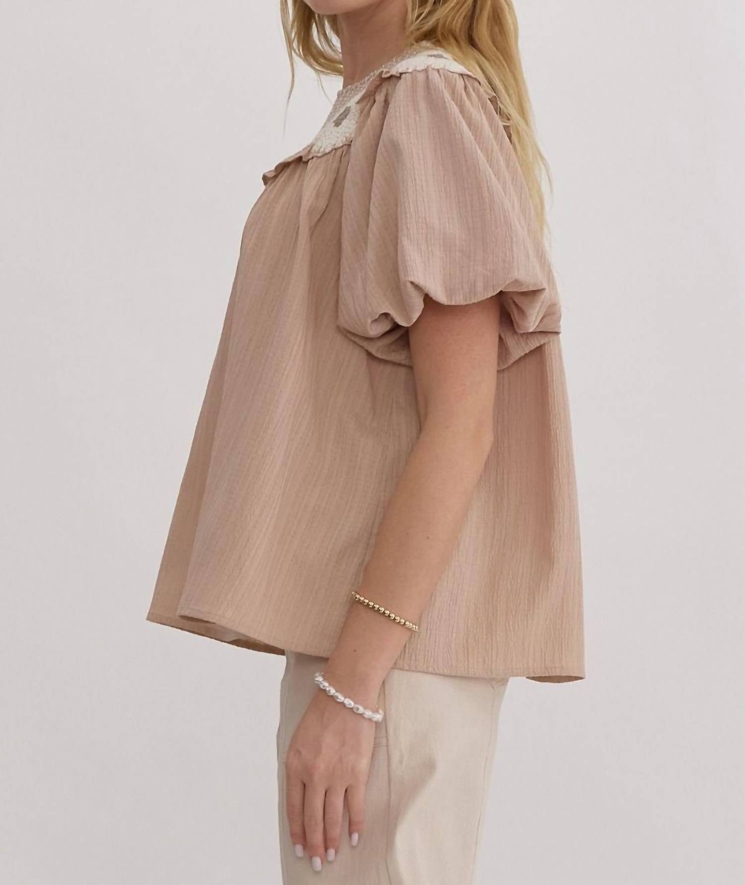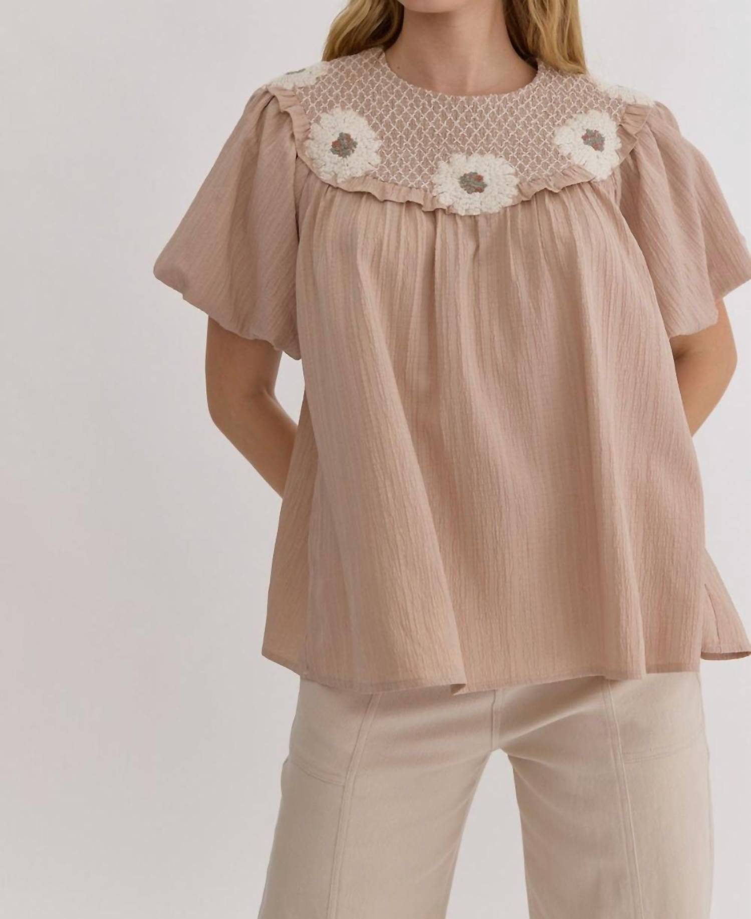 A timeless blouse that will never go out of style. This short sleeve blouse boasts a solid textured design with bubble sleeves, featuring intricate smocking and stitching details. Made from woven Rayon, it is lightweight and non-sheer, ensuring comfort throughout the day. The top has a round crewneck and a convenient button closure at the back, making it an easy choice for your wardrobe. Available in plus size.