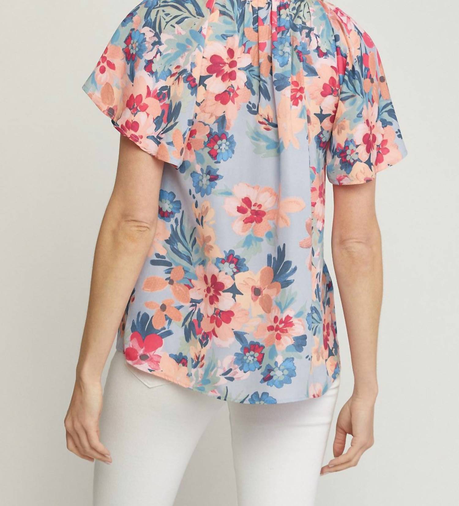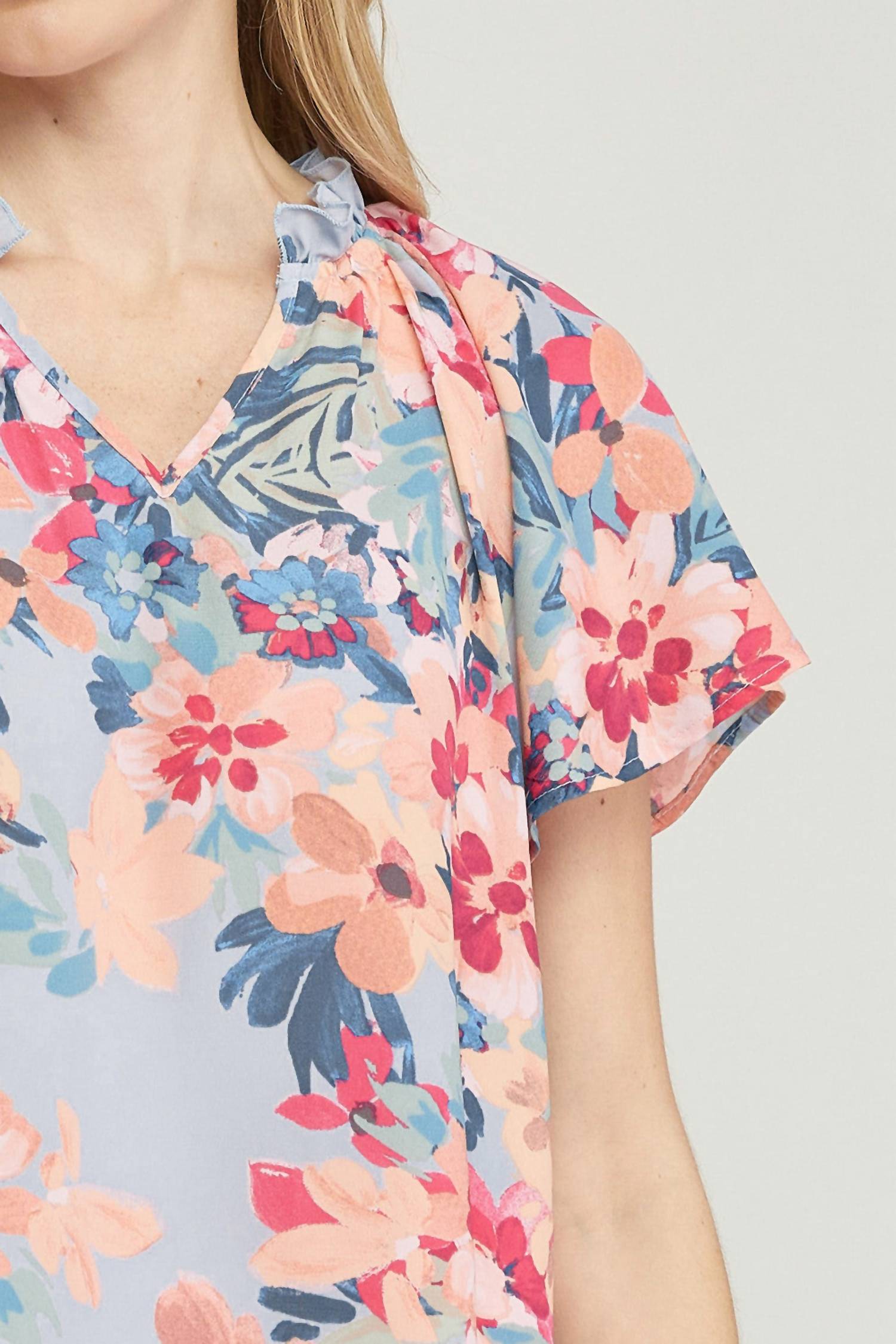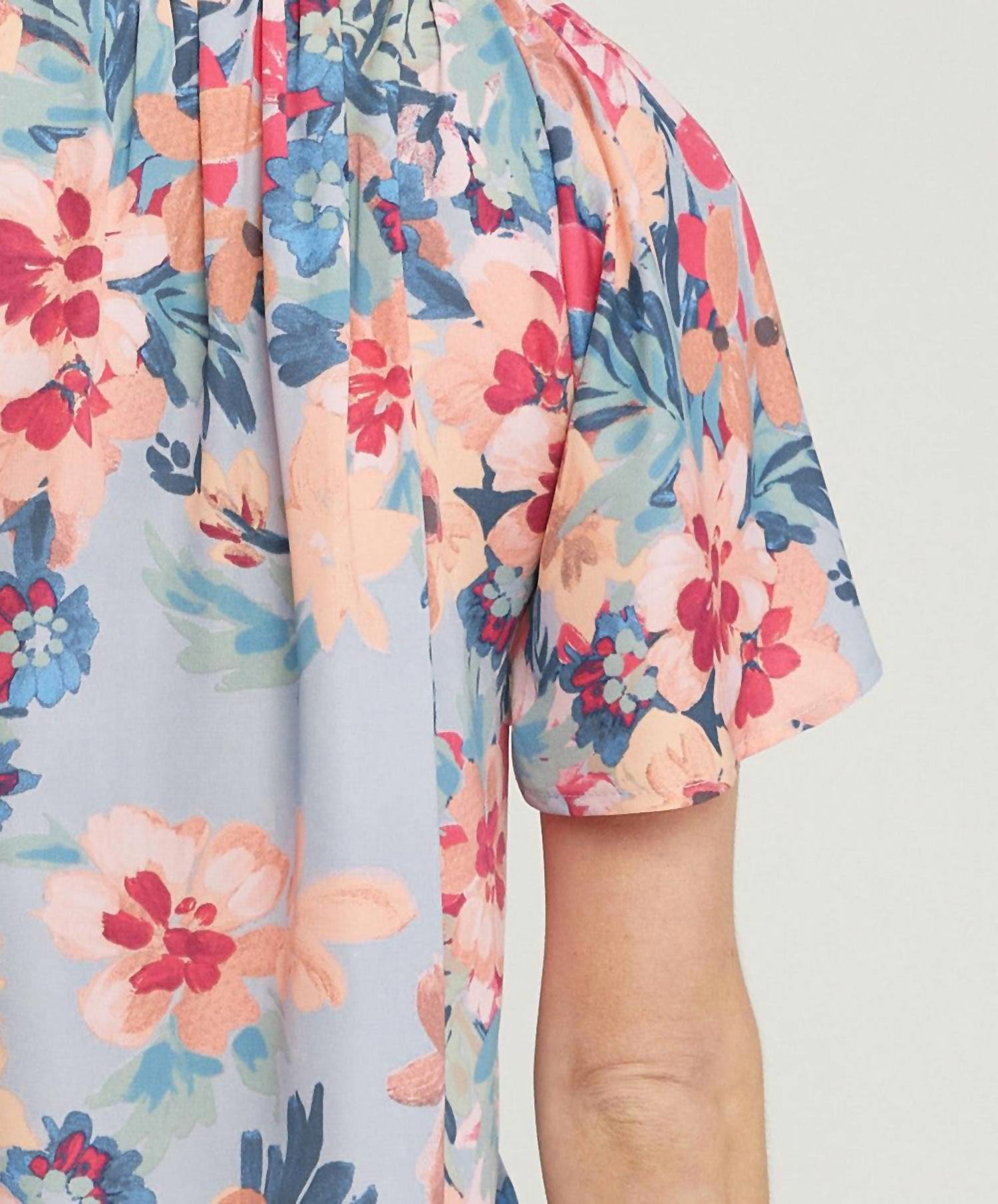 The short sleeve tee you'll want in every color. Introducing the Floral Potter Sleeve Shirt by Entro, a vibrant and stylish addition in blue with a captivating mix of colors. This blouse features short flutter sleeves, a ruffled collar, and a V-neckline, all crafted for an oversized A-line silhouette. The material is 100% polyester with no stretch, offering a comfortable wear that is perfect for both work and casual outings. Made in the USA, this piece is easy to care for with options to hand wash or dry clean, and comes with a pull-on closure. Available in a range of sizes including plus, with a bust measuring up to 56" and length up to 31".