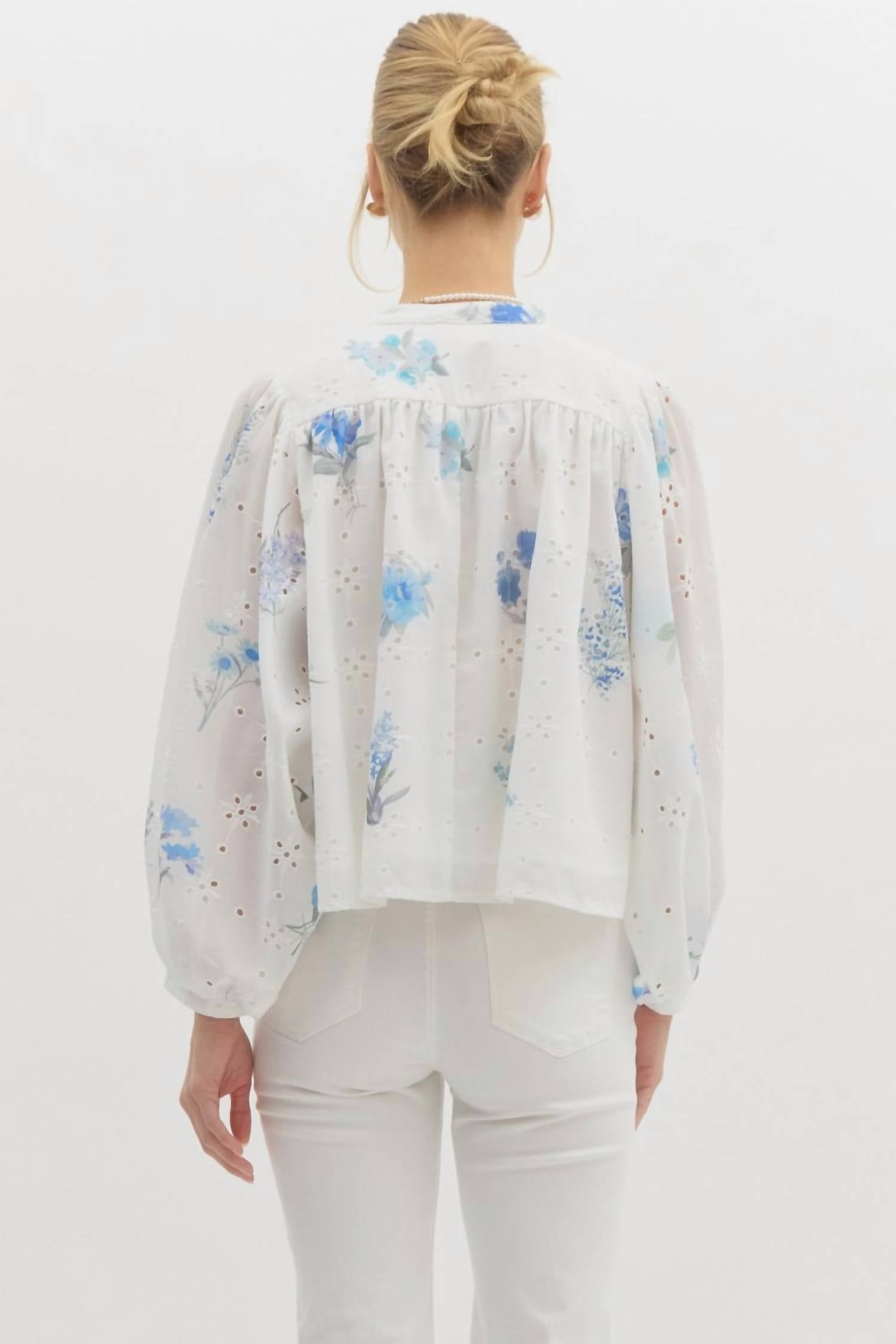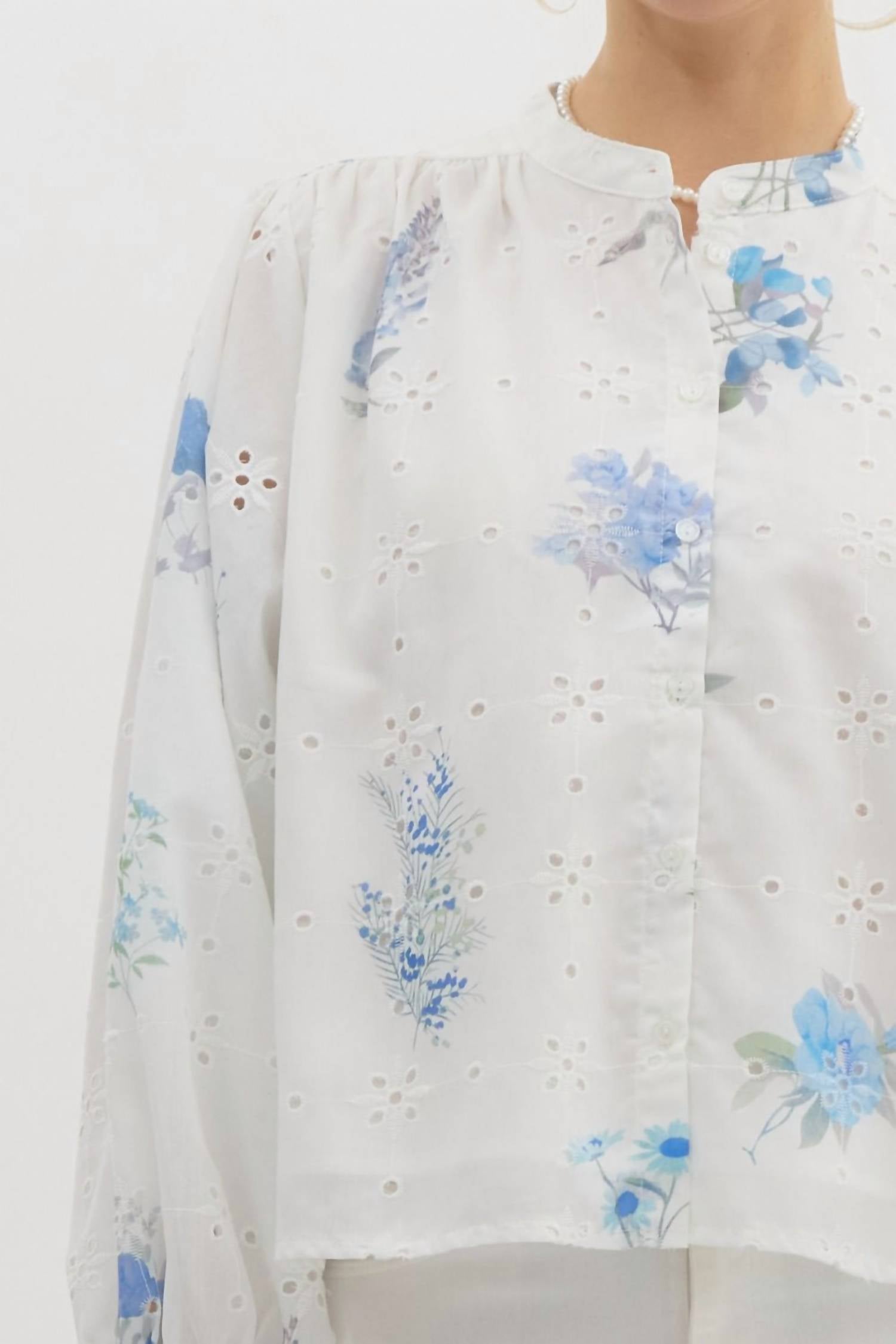 A timeless blouse that will never go out of style. Introducing the Blue and White Floral Print Eyelet Top by Entro, a charming addition to your summer wardrobe. This women's blouse features long sleeves and a crewneck, perfect for a Thanksgiving dinner party. The top showcases a delicate floral pattern, emphasizing quiet luxury style. Closure: Button closure.