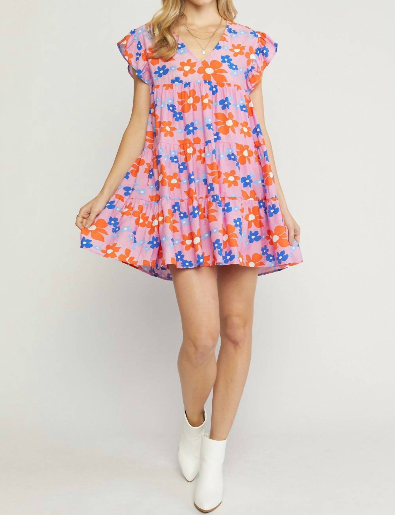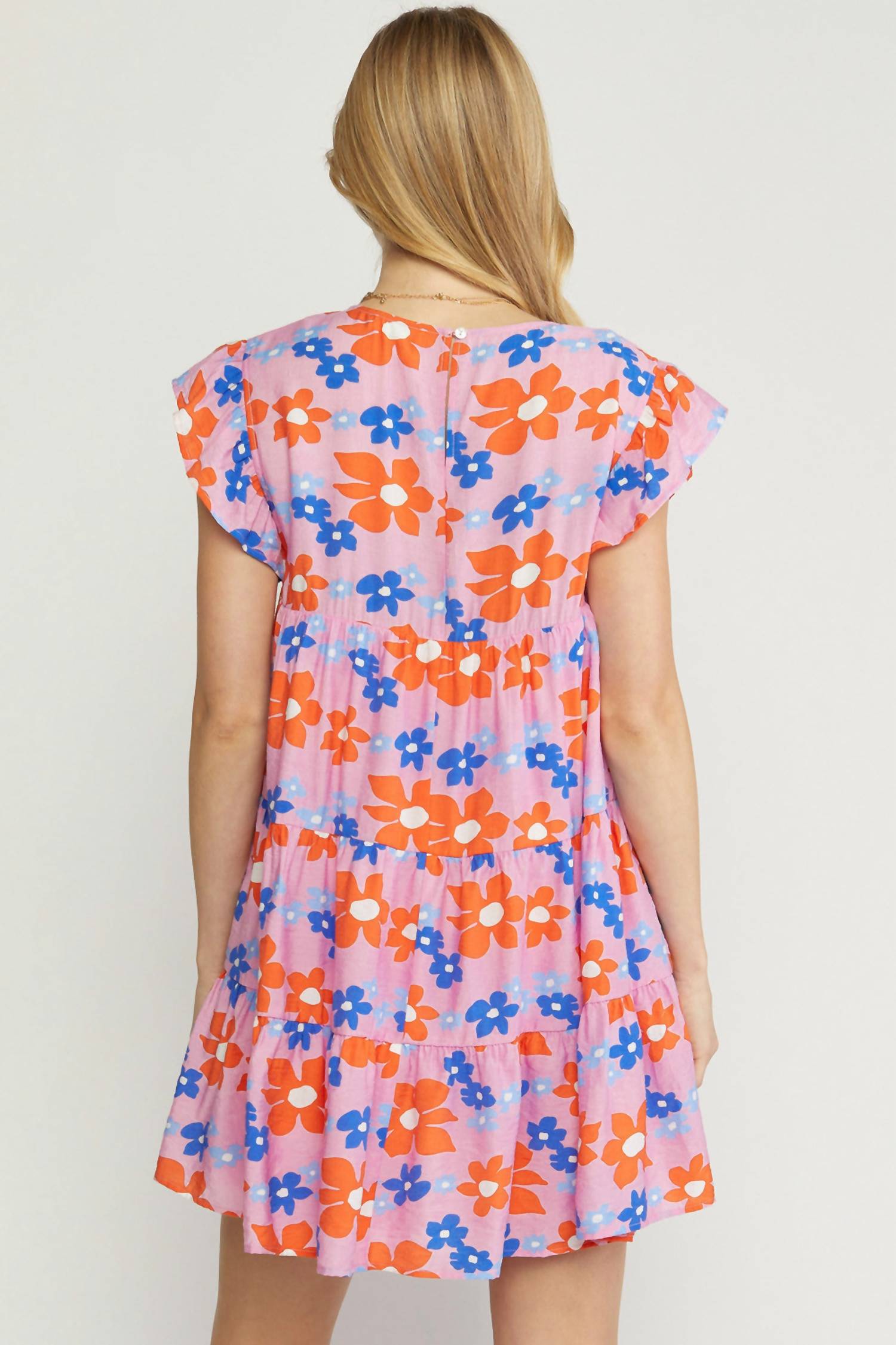 The kind of easy and flattering dress you'll be reaching for all season long. The Floral Tiered Babydoll Dress by Entro is a charming piece crafted for casual elegance. Designed in a lovely pink floral pattern, this mini dress features short ruffled sleeves and a flattering A-line silhouette. Its composition includes 80% Rayon and 20% Nylon, with a lining made of 100% polyester, ensuring comfort and style. Closure includes a button on the back, and it comes equipped with side pockets for convenience. Care for this garment by hand washing or opting for dry cleaning. Dimensions available: Small has a bust of 36" and length of 33", Medium has a bust of 38" and length of 33", Large has a bust of 40" and length of 33". Model is 5'9" and wears a size small.