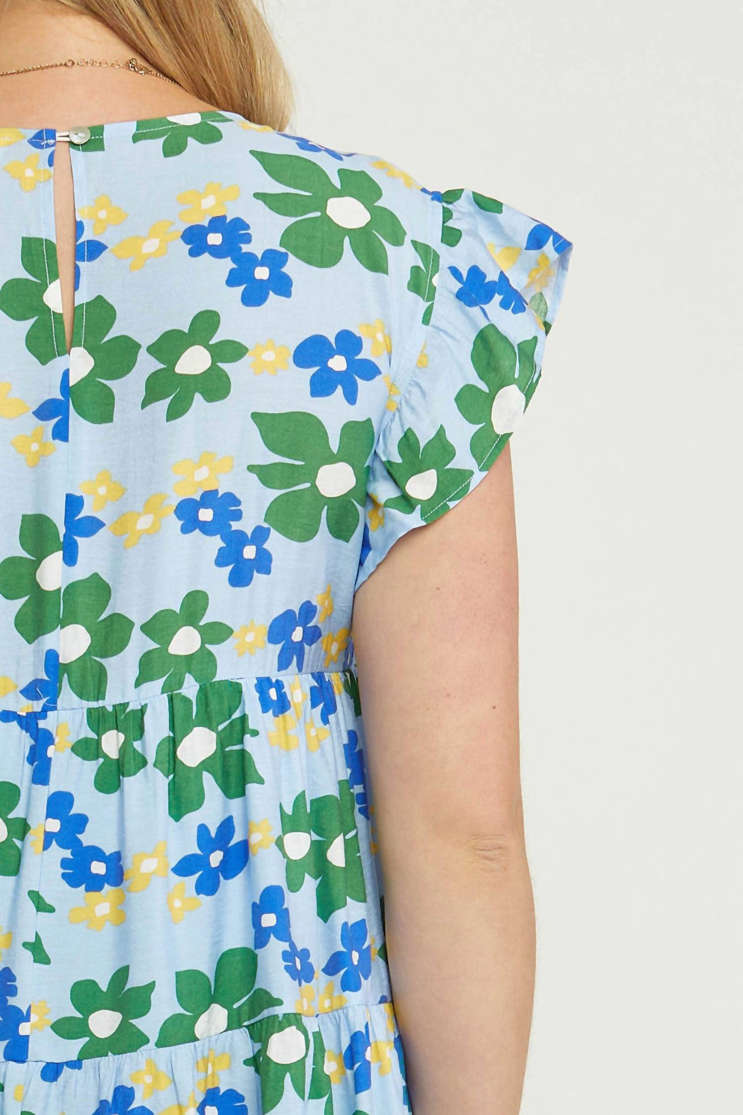Meet the Entro Floral Tiered Babydoll Dress, a stunning mini dress in captivating blue perfect for your next adventure. Featuring short ruffled sleeves and a charming V-neckline, it's beautifully crafted with a tiered, A-line silhouette and side pockets for added practicality. Made from 80% Rayon and 20% Nylon with a 100% polyester lining, this dress closes with a keyhole button and is lined from the waist down. For care, choose between hand washing or professional dry cleaning. Available in plus sizes, with dimensions: XL Bust 46", Length 36". Model is 5'10" and is wearing a size XL.
