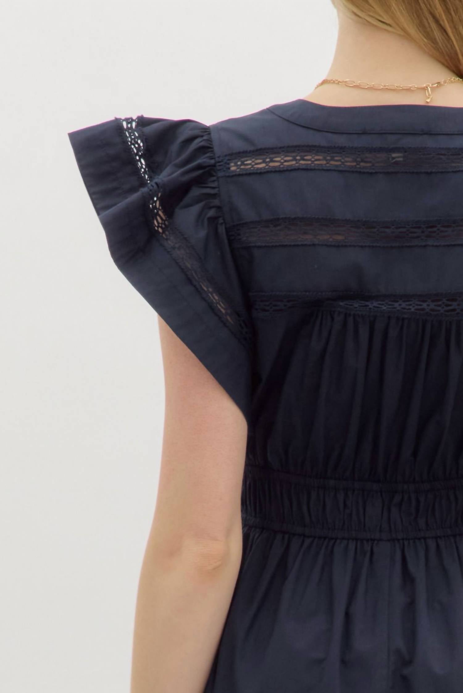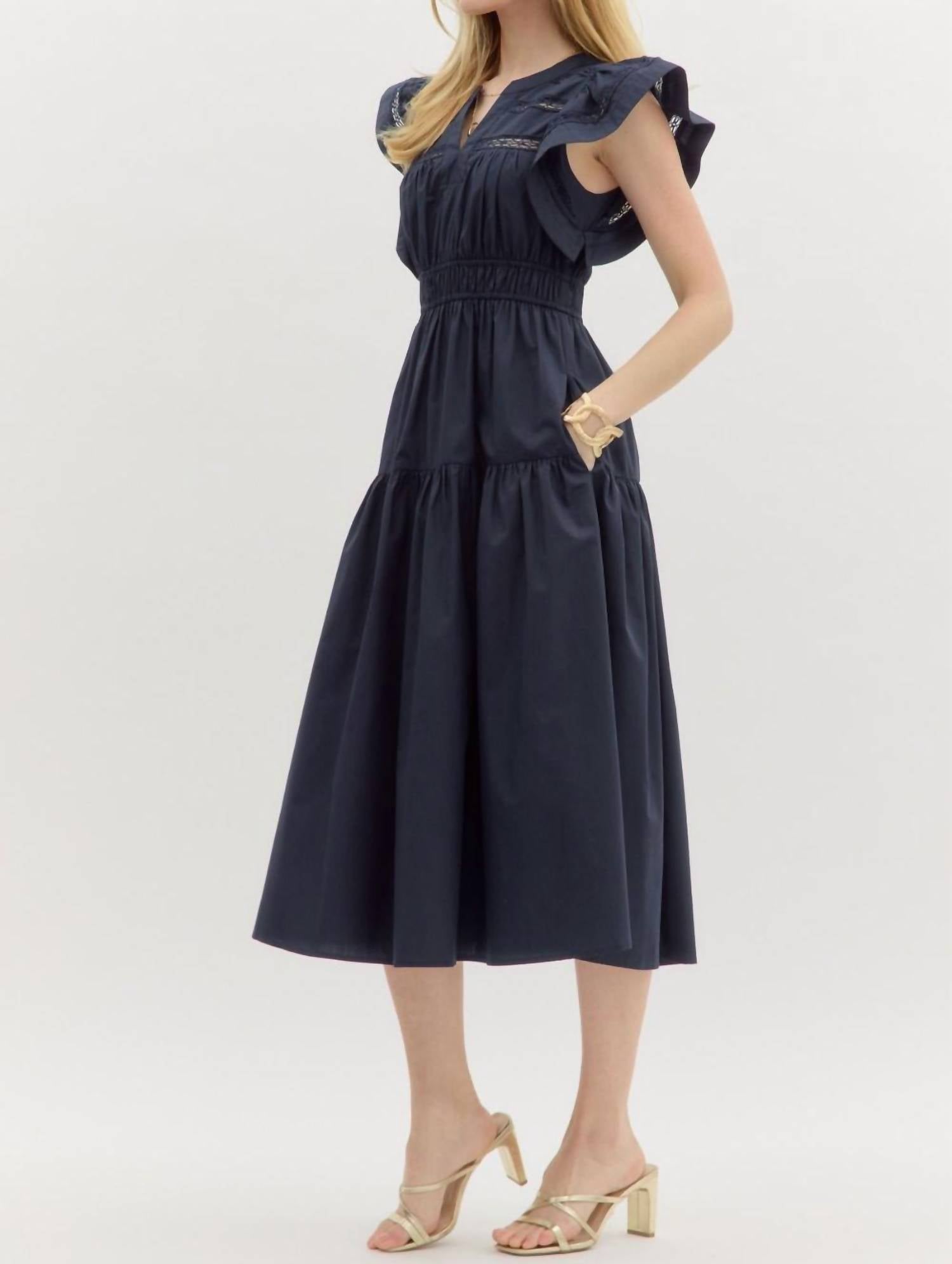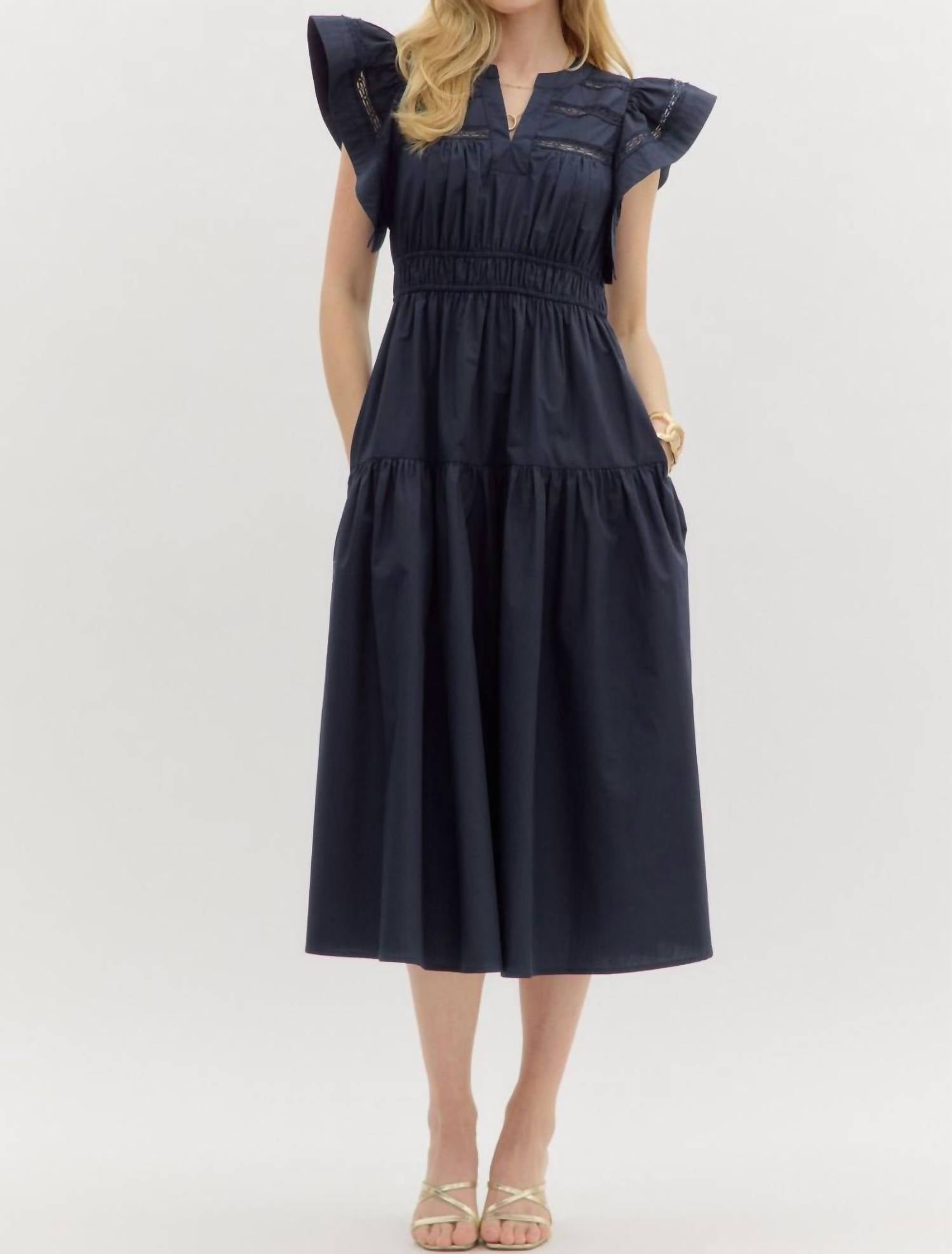 A midi dress so versatile, your options for wearing it are endless. Introducing the Flutter Sleeve Dress by Entro, a charming navy midi dress perfect for your spring wardrobe. This A-line silhouette features delicate cap sleeves and a flattering split V-neck, highlighted by lace trim and ruching accents at the elasticated waist. The dress is woven and lightweight, making it ideal for any church occasion. Enjoy the convenience of pockets while wearing this elegant, solid-patterned dress.