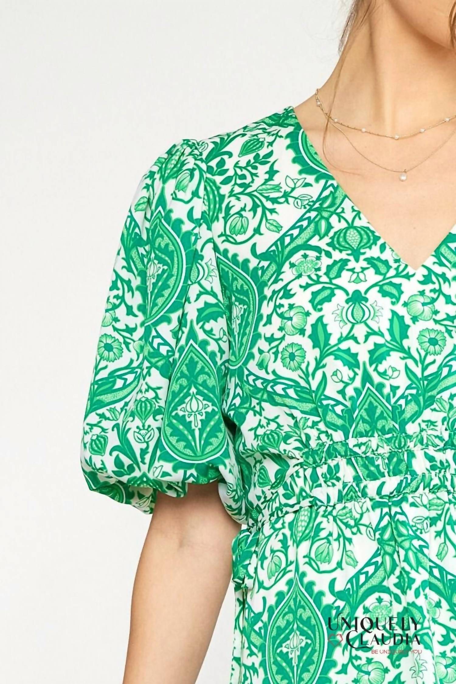 Entro - Francesca Green Ornate Print Puff Sleeves Ruffle Dress