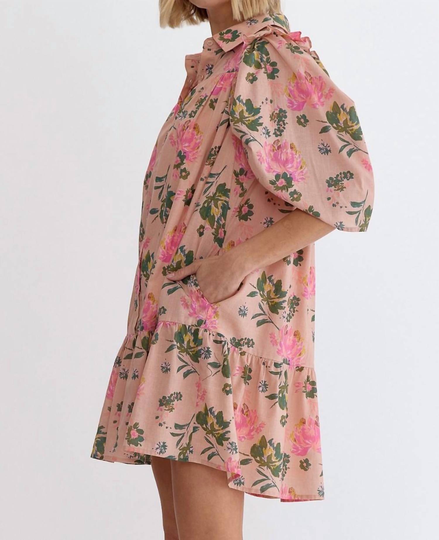 Meet the Garden Blooms Dress by Entro, a stunning mini dress in a charming peach floral pattern that embodies summer's exuberance. Crafted with half sleeves and ruffled shoulder trimming, this A-line silhouette is accentuated with a chic collared button-up design and functional button closure. The dress is made from 100% cotton with a 100% polyester lining, offering both comfort and style. With side pockets for extra functionality, this woven piece is perfect for any vacation or Easter outing.