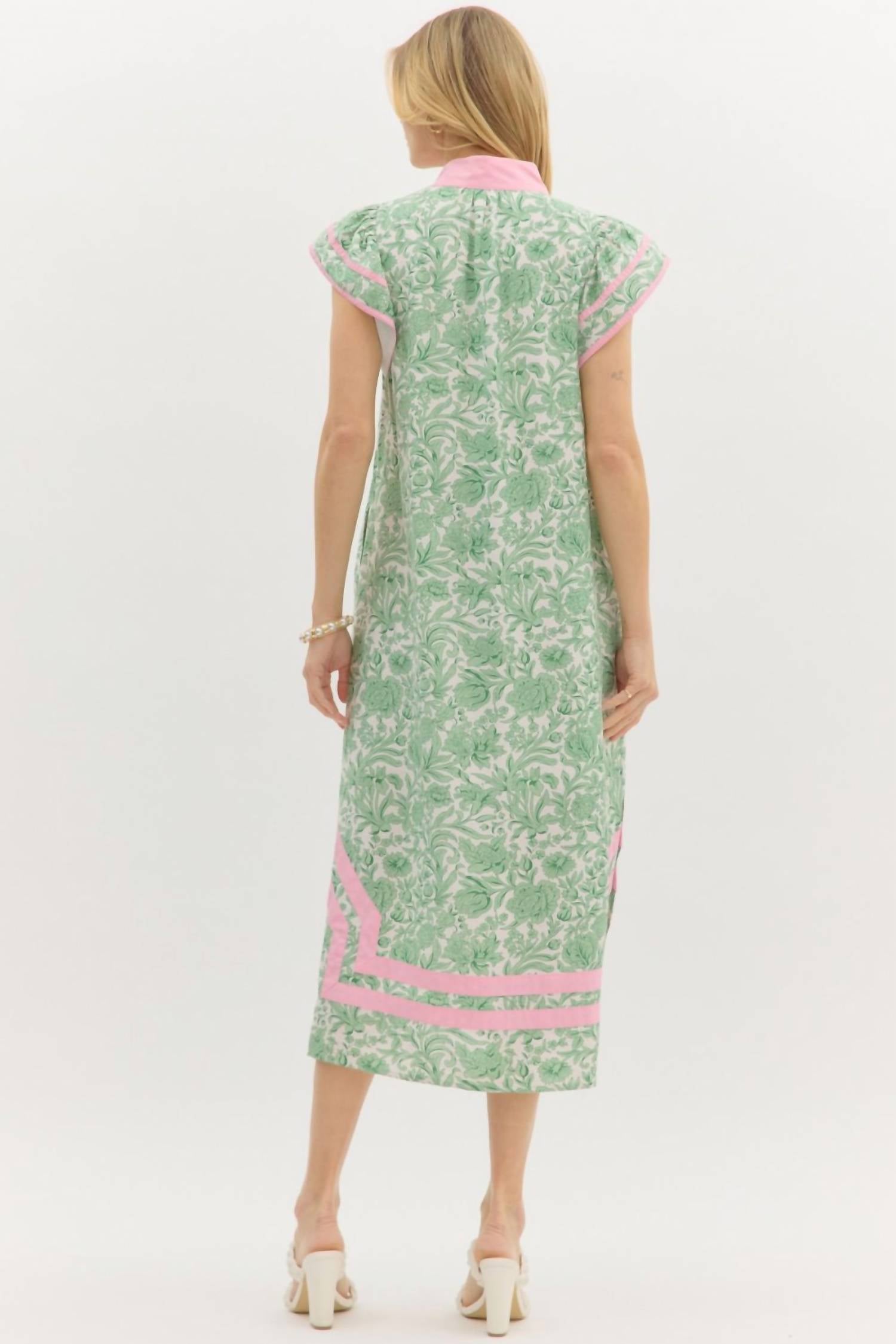 Just add slides or mules and you are good to go. Introducing the Garden Key Dress by Entro, a chic addition to your wardrobe in a captivating floral print. This midi dress features short flutter sleeves and a sophisticated caftan-inspired high neck band collar, embodying boho chic style. The composition is 83% Rayon and 17% Nylon, with a practical pull-on closure and convenient side pockets. Care instructions include machine wash and tumble dry, making it both fashionable and easy to maintain.