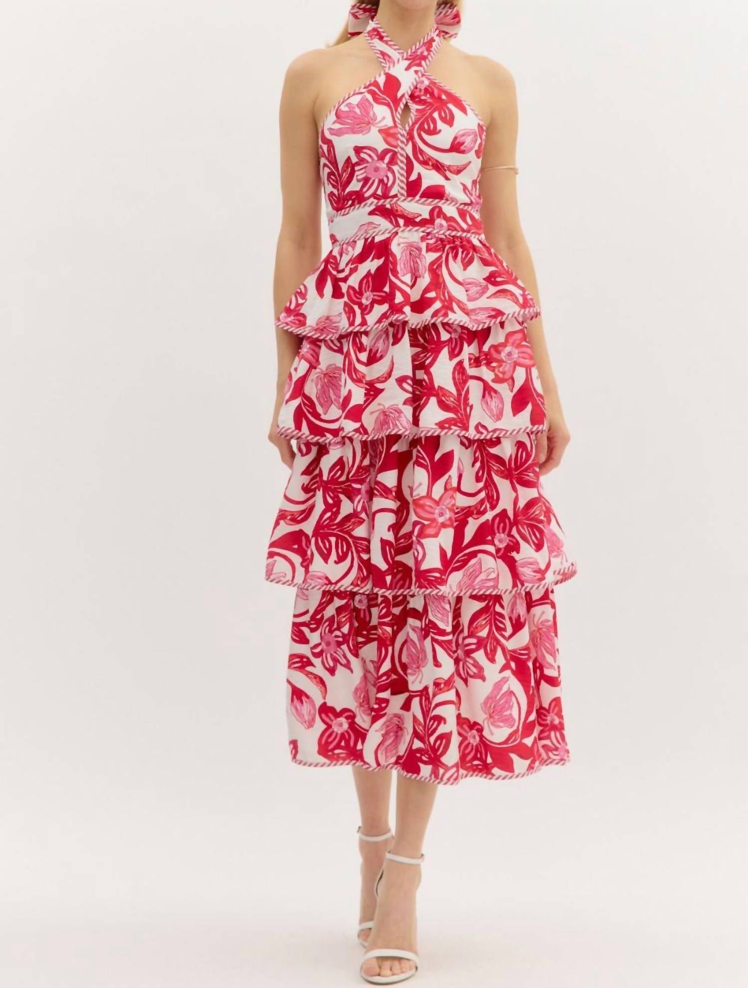 Embrace elegance with the Entro Halter Bow Tied Tiered Paisley Midi Dress, perfect for your next holiday party. This sleeveless dress in vibrant red features a flattering A-line silhouette and a delicate floral paisley pattern. Crafted from lightweight woven material, it boasts a stylish tie closure at the halter neckline. Care instructions: Machine wash.
