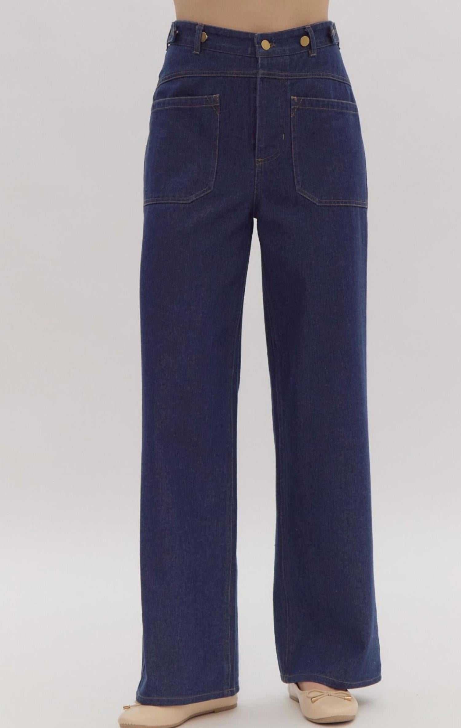 A flattering silhouette that's suprisingly versatile. These wide-leg, high-rise pants are crafted from an 80% cotton and 20% polyester blend, ensuring both style and comfort. They feature functional pockets, an adjustable waist, and a secure zip closure, with belted loops adding versatility to your fashion-forward wardrobe. The inseam measures 31.5 inches.