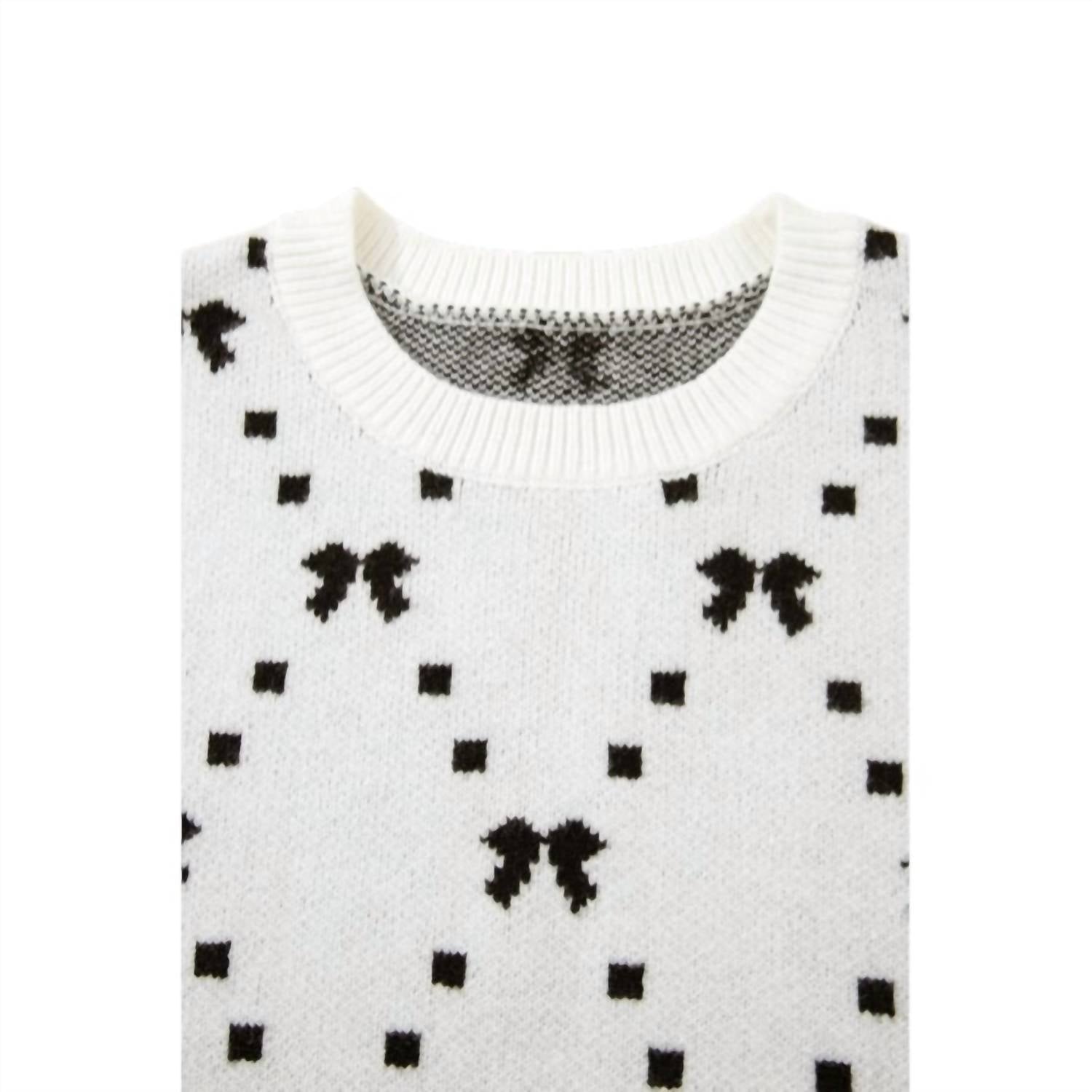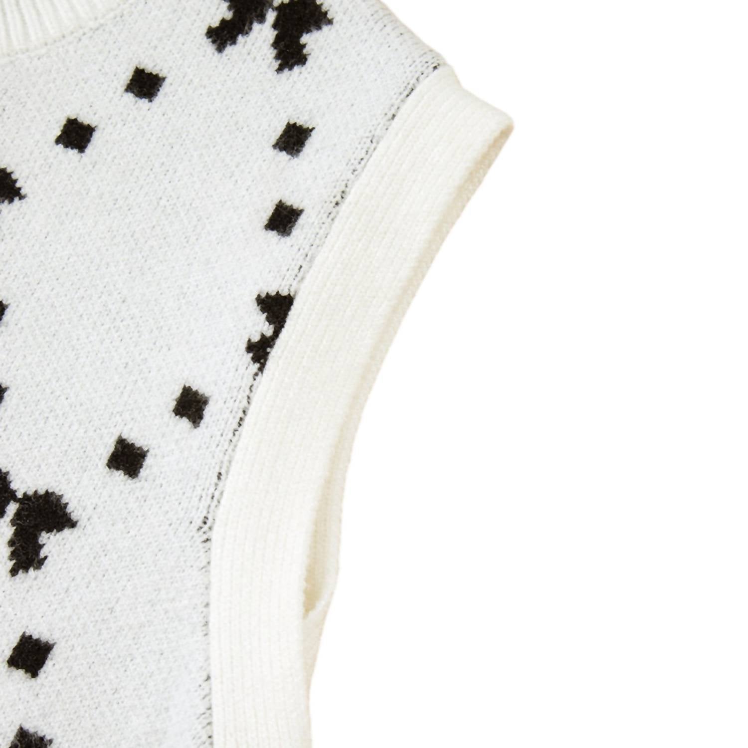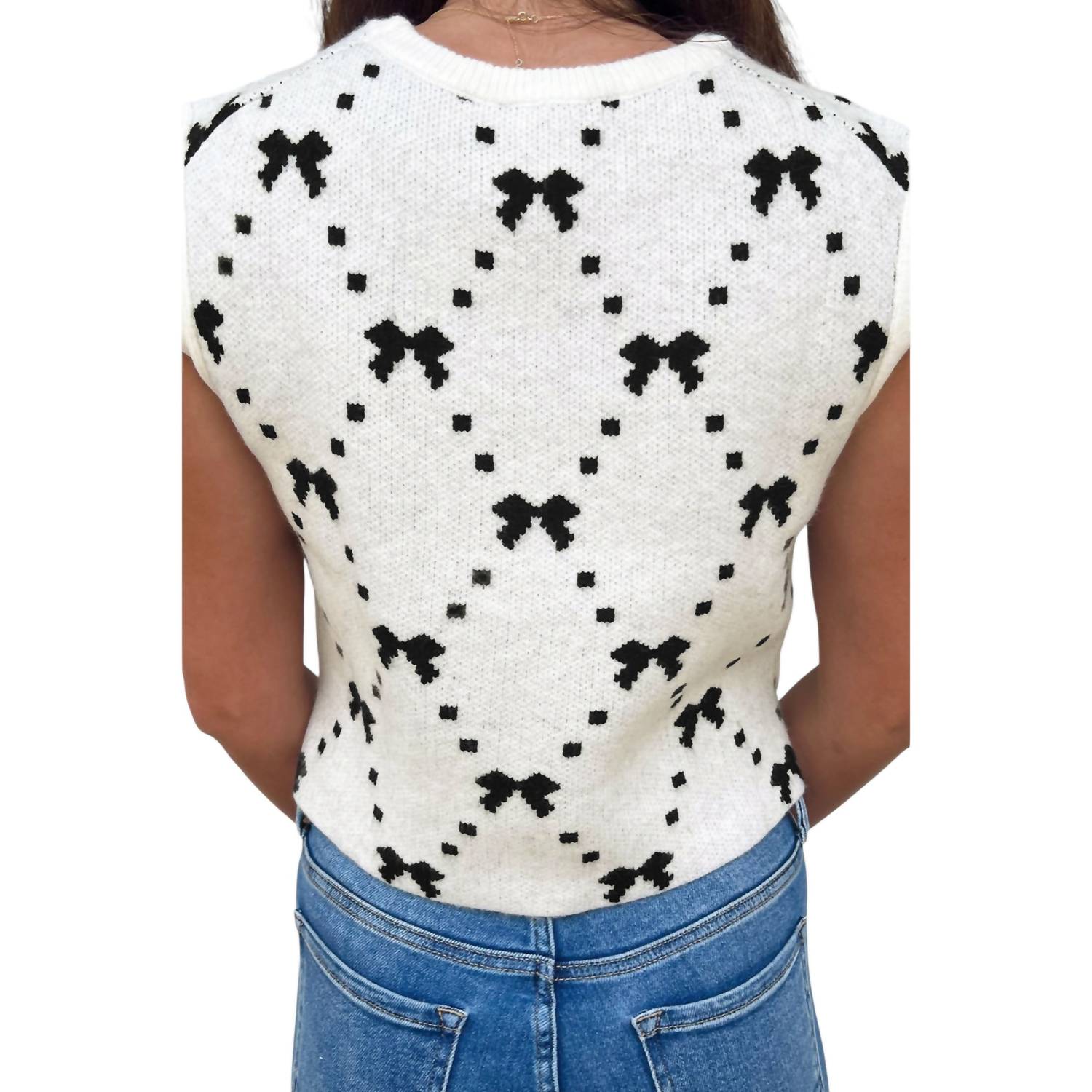 The ultimate go-to sweater, expertly crafted to provide the perfect combination of warmth and style. Its classic design and soft fabric make it a must-have addition to your wardrobe. Introducing the Karlee Sweater Vest by Entro, a chic and cozy addition to any summer wardrobe. This sleeveless sweater features a playful bow print and side snap button closures, making it a versatile layering piece or standalone statement. Crafted from a durable blend of 52% viscose, 26% polyester, and 22% polyamide, this vest promises comfort and style for vacation-ready outfits. With its crewneck design and trendy Y2K vibe, it's perfect for adding a fashionable touch to your ensemble.