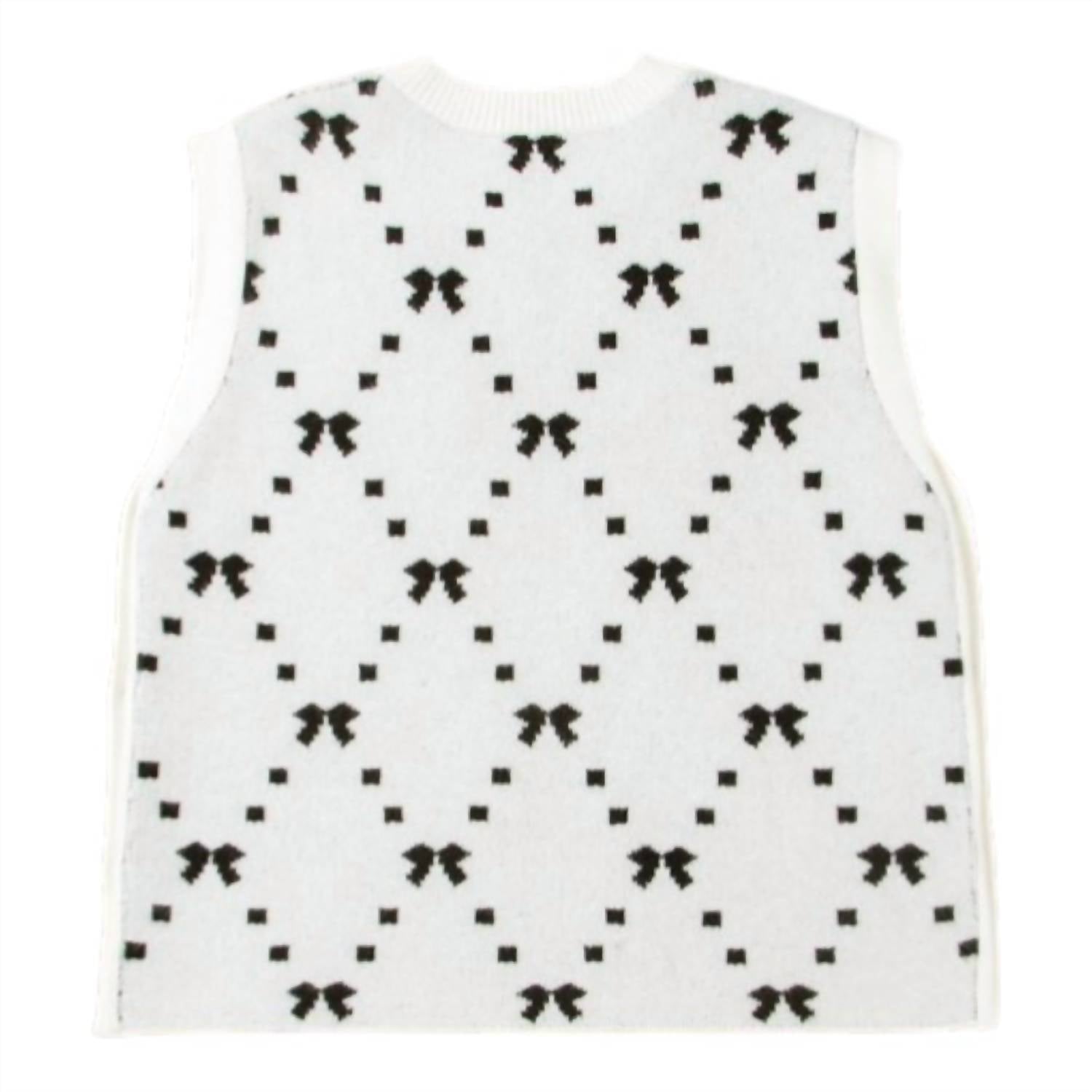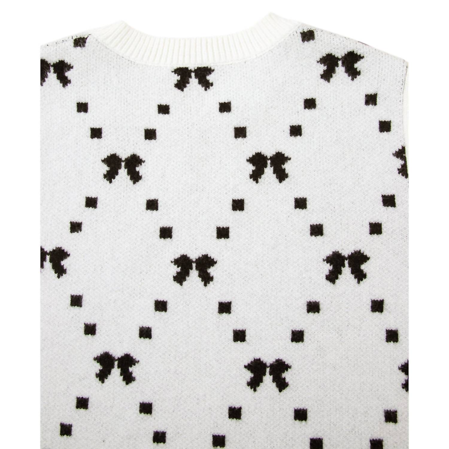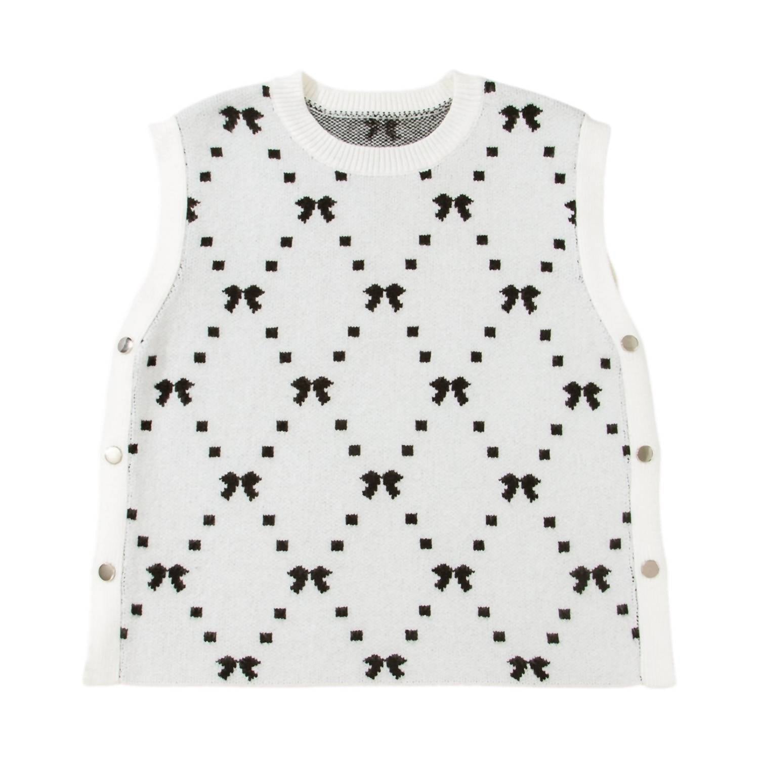 Introducing the Karlee Sweater Vest by Entro, a chic and cozy addition to any summer wardrobe. This sleeveless sweater features a playful bow print and side snap button closures, making it a versatile layering piece or standalone statement. Crafted from a durable blend of 52% viscose, 26% polyester, and 22% polyamide, this vest promises comfort and style for vacation-ready outfits. With its crewneck design and trendy Y2K vibe, it's perfect for adding a fashionable touch to your ensemble.