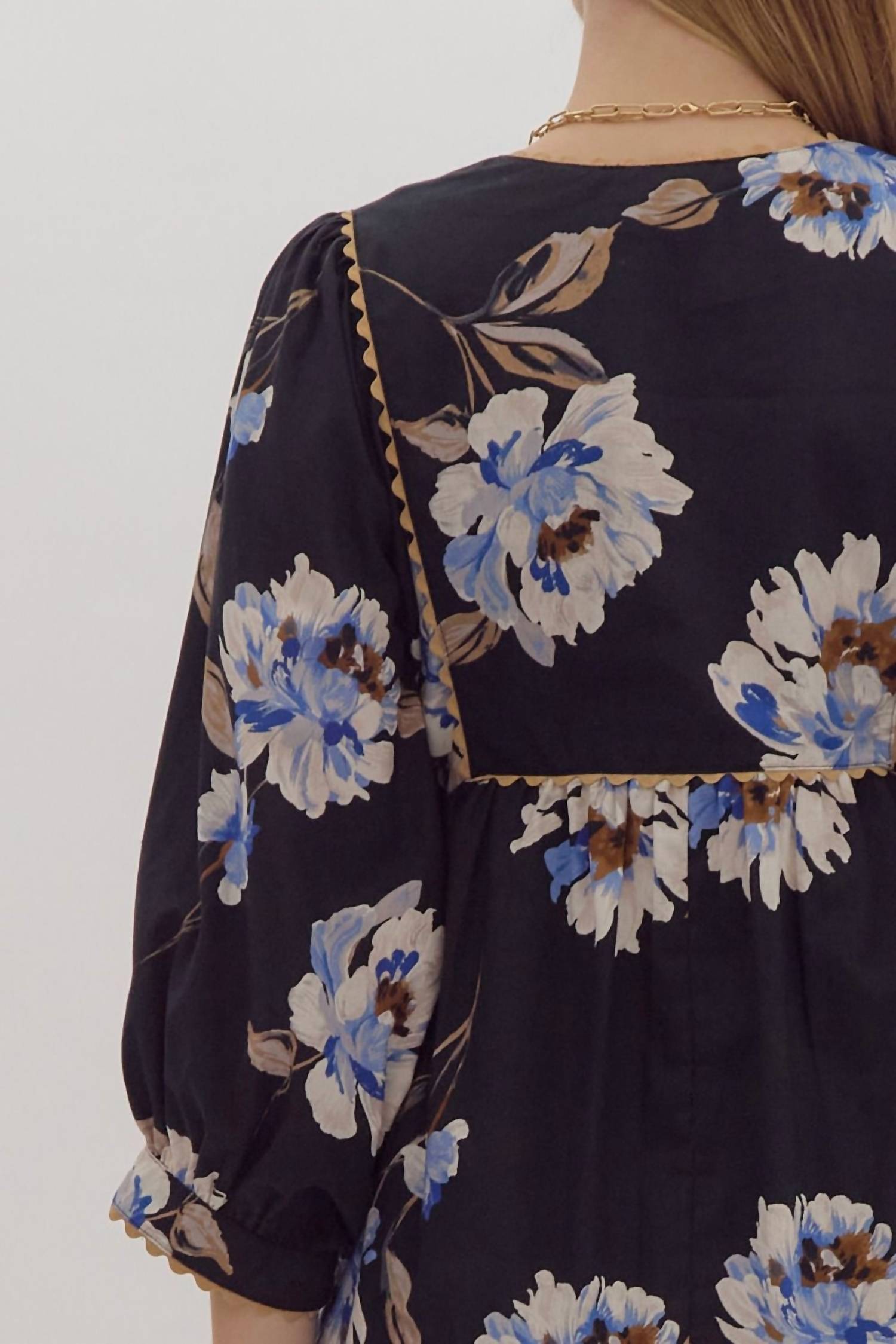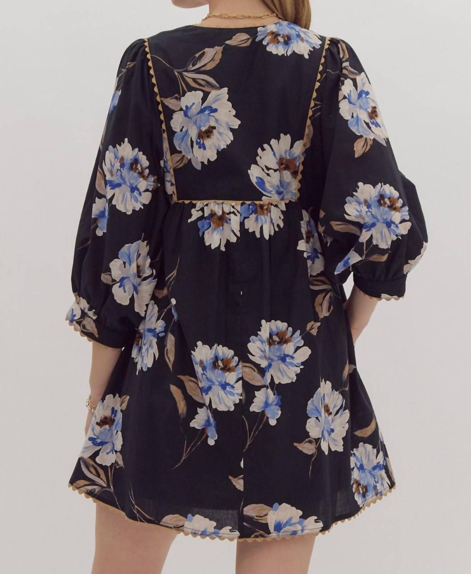 A short and breezy dress for those warmer days. Bold Floral Mini Dress. Lightweight with no stretch. Three quarter balloon sleeve. V-neck and pockets. Lined. 100% Cotton. Machine wash cold, no drum drying.