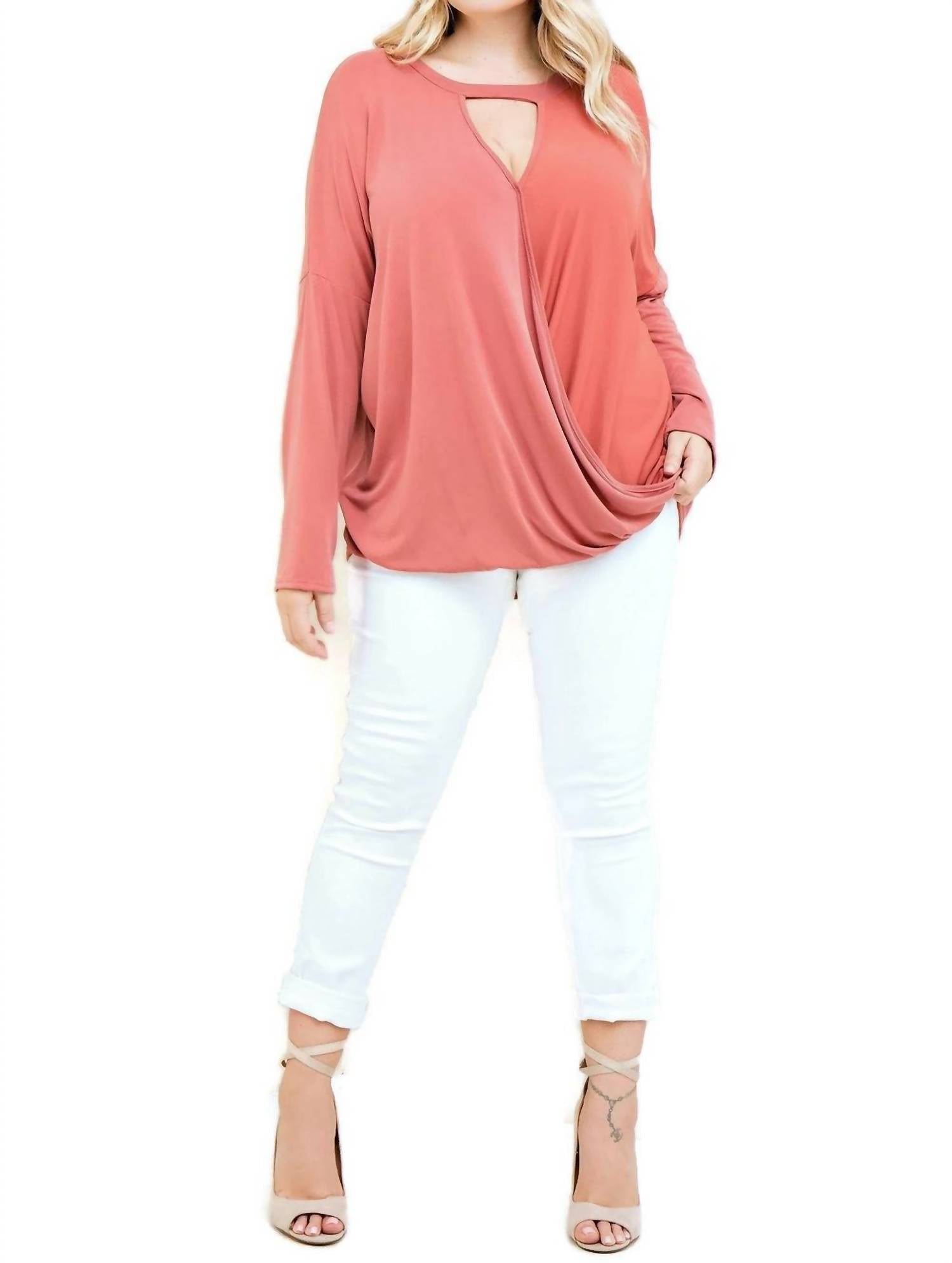 A long sleeve top you can wear with denim, skirts, well... just about anything! Introducing the Keyhole Wrap Top by Entro, a stylish addition to your wardrobe in a rich rust hue. This V-neck top boasts long sleeves and a flattering flowy fit, perfect for any occasion. Crafted from 72% Modal and 28% Polyester, this lightweight fabric ensures comfort and a premium feel. Care for this piece by hand washing cold and laying flat to dry. Closure type is pull-on. Available in sizes XL with a bust of 48" and length of 29", 1X with a bust of 50" and length of 29", and 2X with a bust of 52" and length of 29".
