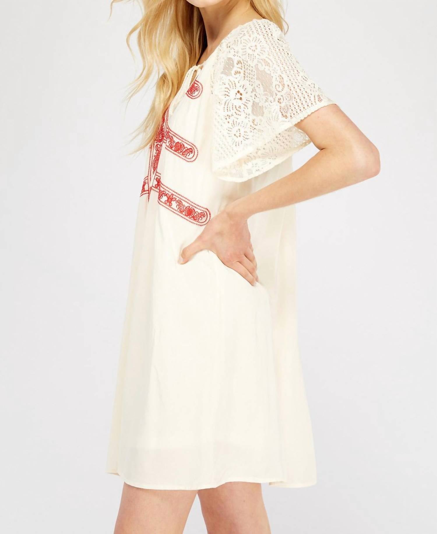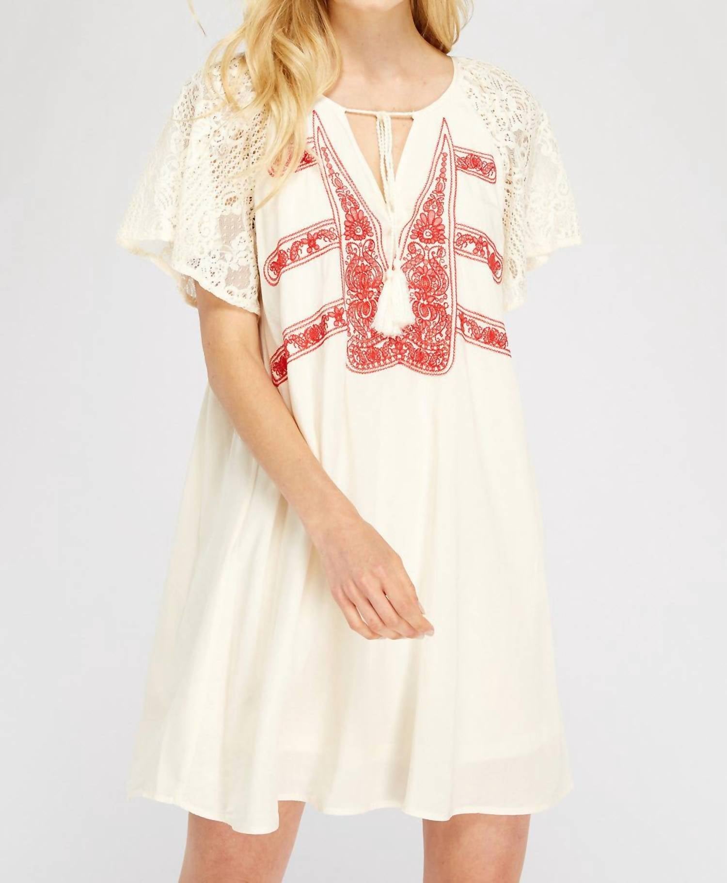 Step into bohemian charm with the Lace & Embroidered Mini Dress by Entro, an enchanting addition in a natural hue. This lightweight mini dress features short lace sleeves, a split V-neckline with tassel ties, and beautiful embroidery that all come together in an A-line silhouette. Composition: 100% Rayon. Closure: Tie closure. Care: Hand wash cold.
