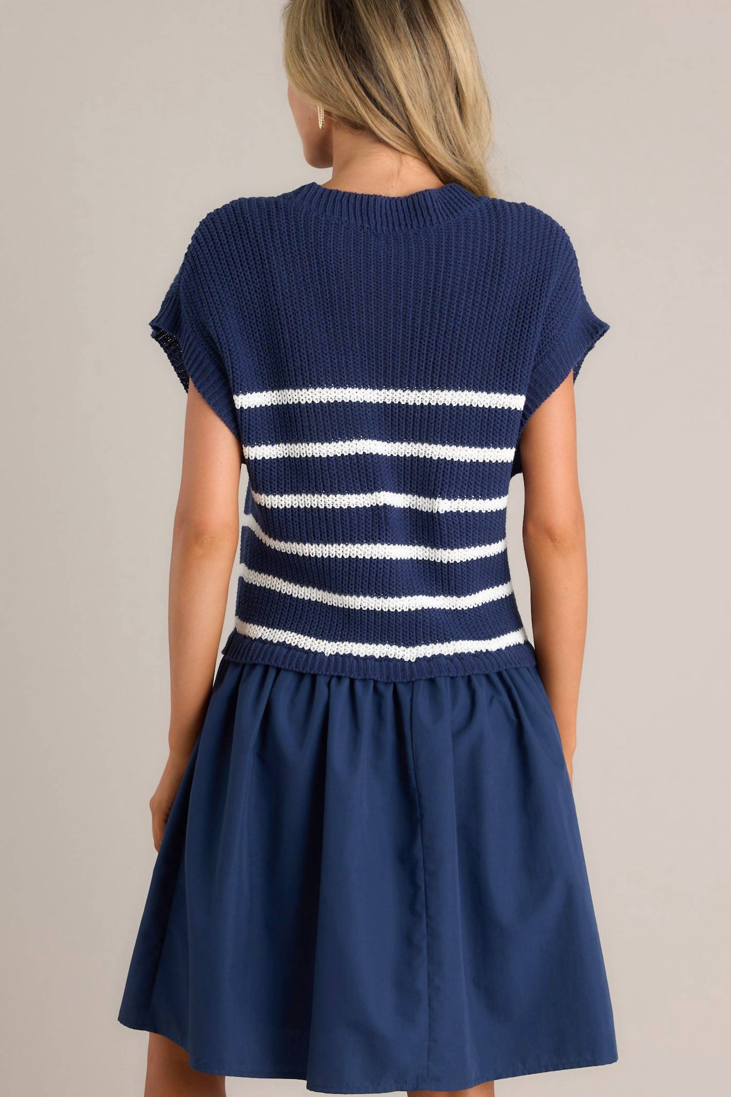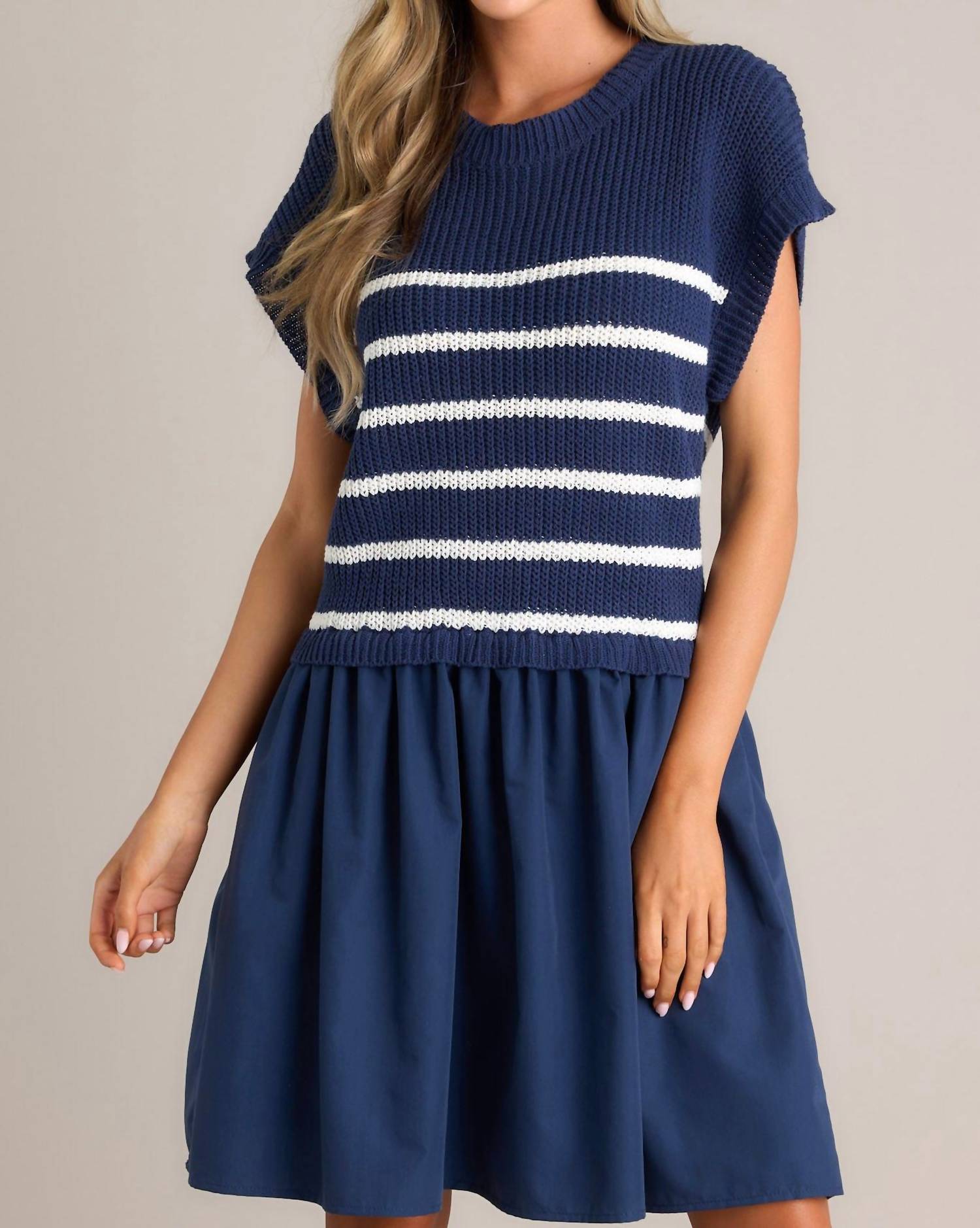The kind of easy and flattering dress you'll be reaching for all season long. Experience effortless chic with the Lake Life Striped Dress by Entro, a statement piece perfect for summer occasions. This mini A-line dress features a comfortable knit sweater top paired with a contrasting skirt in navy and white stripes. Fabric composition includes Self: 100% Cotton and Contrast: 80% Polyester, 20% Cotton, with a 100% Rayon lining for added comfort. Designed with short sleeves and a crewneck, it offers a convenient pull-on closure. Care instructions are simple: hand wash cold. Model is wearing a size small.