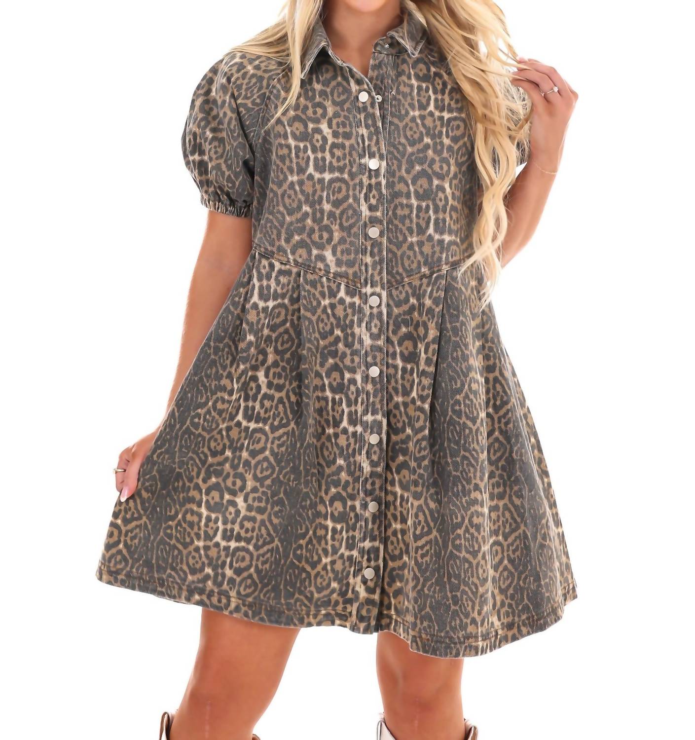 A short and breezy dress for those warmer days. The Leopard Denim Mini Dress by Entro is a striking piece with puff short sleeves and a collared neckline, perfect for making a bold statement. Made from 100% cotton, this mid-thigh length mini blends a fierce animal print with a classic, structured fit. Featuring a full snap button closure, it offers versatile styling as either a dress or a layering piece. Care instructions recommend hand washing cold and line drying to maintain its standout style. Shea, at 5'1", dons a size Large.