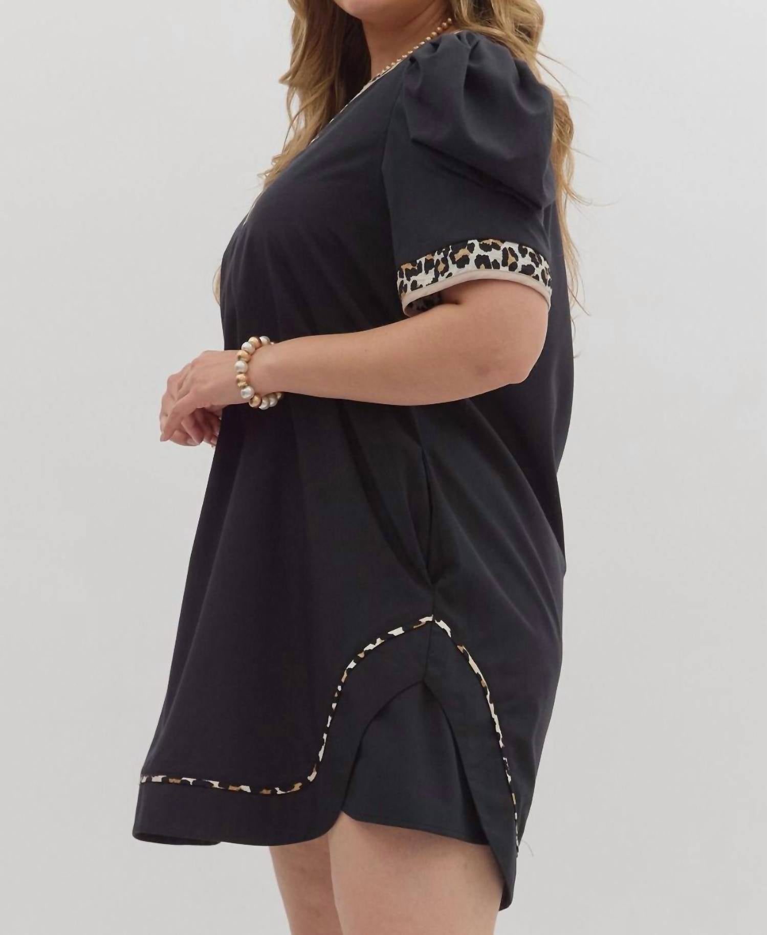 Step into style with the Entro Life On The Edge Dress in a striking olive hue, perfect for any casual or holiday occasion. This shift silhouette dress features short pleated puff sleeves and eye-catching animal pattern contrast trim detail. Made from a blend of 80% polyester and 20% cotton, it offers practicality with side pockets and a comfortable lining. The dress boasts a flattering V-neckline and is easy to care for with machine wash and tumble dry instructions.
