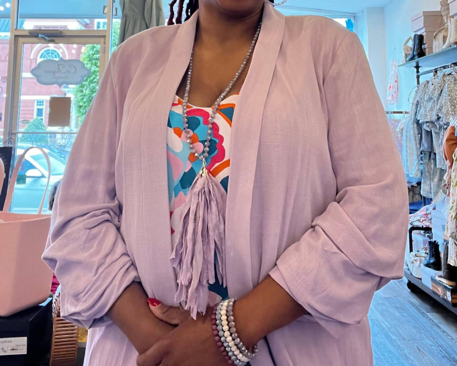 An elevated version of your favorite classic blazer. Elevate your wardrobe with the Linen Blend Blazer by Entro, a chic addition in a beautiful lilac shade. Designed with long sleeves and a structured silhouette thanks to the shoulder pads, this blazer offers both style and sophistication. Crafted from a comfortable linen blend, it features a pull-on closure for easy wear. Ideal for making a statement, it pairs seamlessly with your favorite outfits.