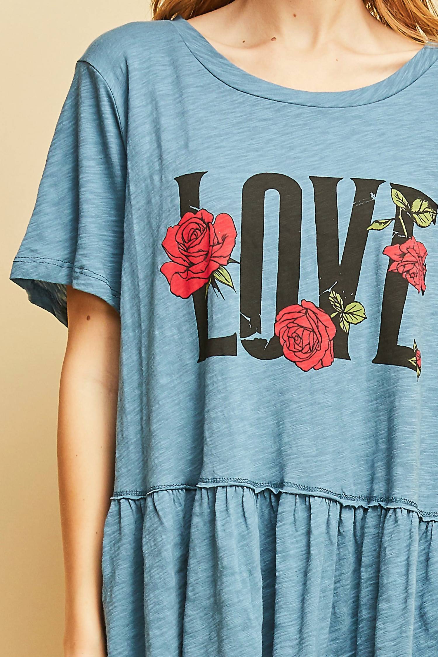 Introducing the Love Graphic Peplum Top by Entro, a stylish addition to any wardrobe with its vibrant blue hue and playful "love" graphic print. This short-sleeve tee is crafted from 100% cotton, ensuring a lightweight and breathable wear. Made in the USA, it features a flattering peplum hem and a classic scoop neck design, making it an effortless choice for casual outings. Closure: Pull-on. Care instructions: Hand wash cold.