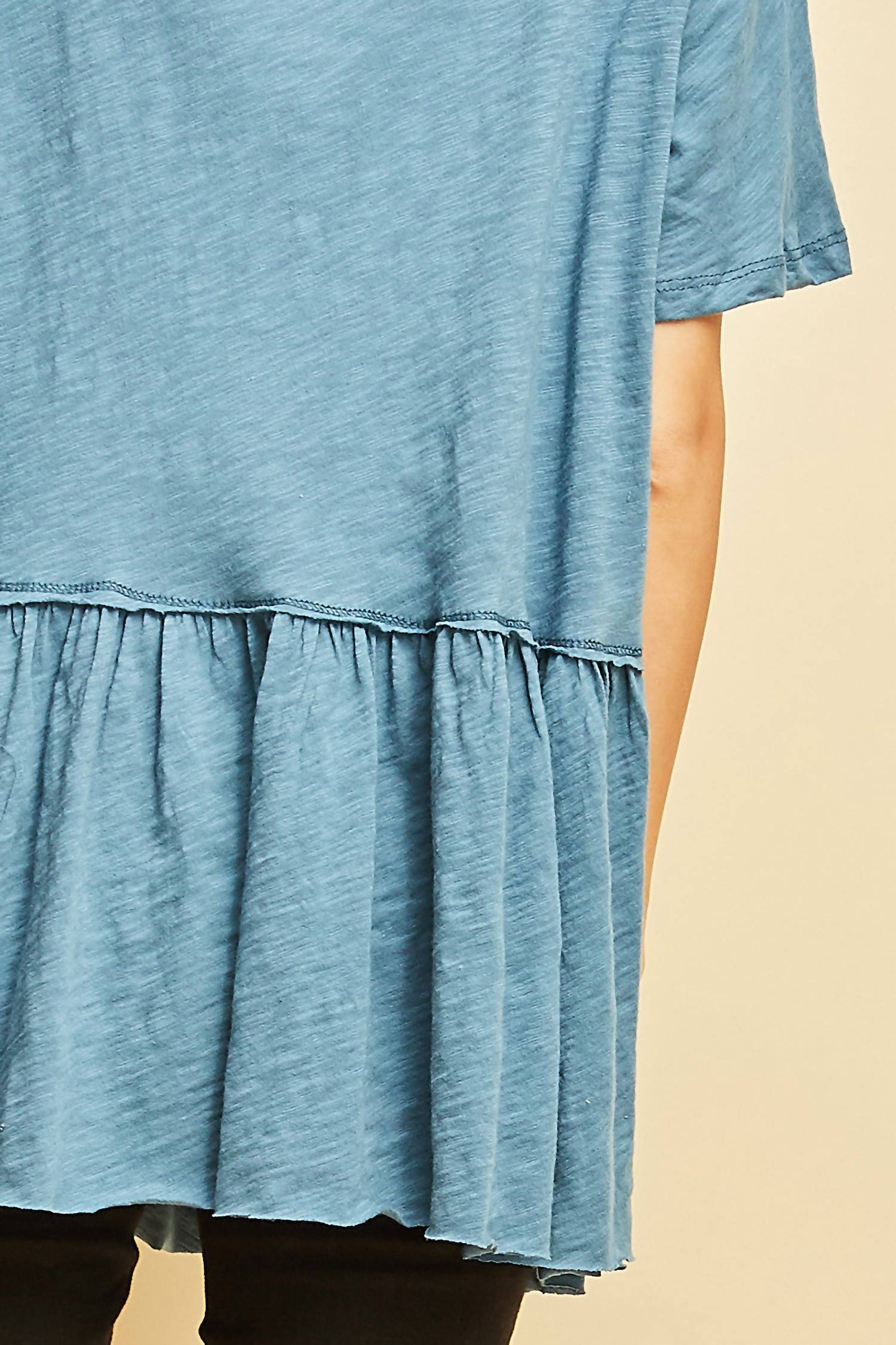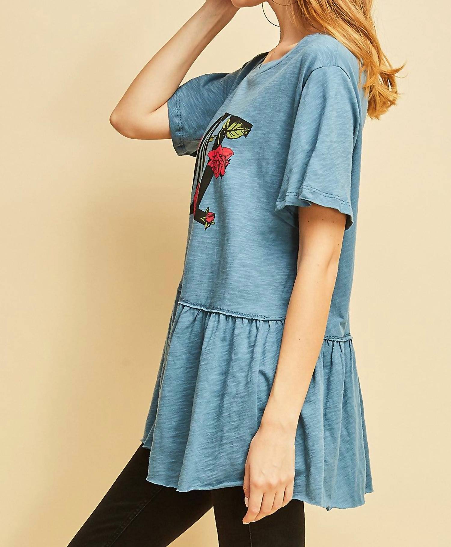 This classic, short sleeve tee will be your go-to staple this season and beyond. Introducing the Love Graphic Peplum Top by Entro, a stylish addition to any wardrobe with its vibrant blue hue and playful "love" graphic print. This short-sleeve tee is crafted from 100% cotton, ensuring a lightweight and breathable wear. Made in the USA, it features a flattering peplum hem and a classic scoop neck design, making it an effortless choice for casual outings. Closure: Pull-on. Care instructions: Hand wash cold.