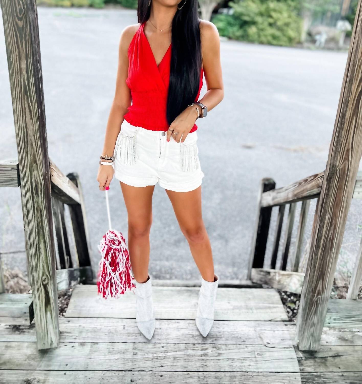 The perfect crop top for those warmer weather days. Introducing the Loved By You Top by Entro, a vibrant red piece designed to elevate your summer wardrobe. This sleeveless crop top features a flattering V-neck and a smocked waist with a self-tie closure at the back of the neck. Crafted from a lightweight, breathable blend of 80% Rayon and 20% Nylon, it ensures comfort on sunny days. This non-sheer, lined top is perfect for summer adventures and is modeled by a 5'6" individual wearing a size small.