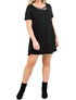 Elevate your wardrobe with the Modal Strappy Tee Shirt Dress by Entro, crafted for plus sizes with super soft and stretchy fabric for ultimate comfort. This solid black dress features short sleeves, a scoop neckline with strappy details, and an A-line midi silhouette that flatters every body type. Composition: 94% Polyester, 6% Spandex. Closure: Pull on. Care: Hand wash cold. Available in sizes: XL Bust 44", L 38"; 1X Bust 46", L 38"; 2X Bust 48", L 38".