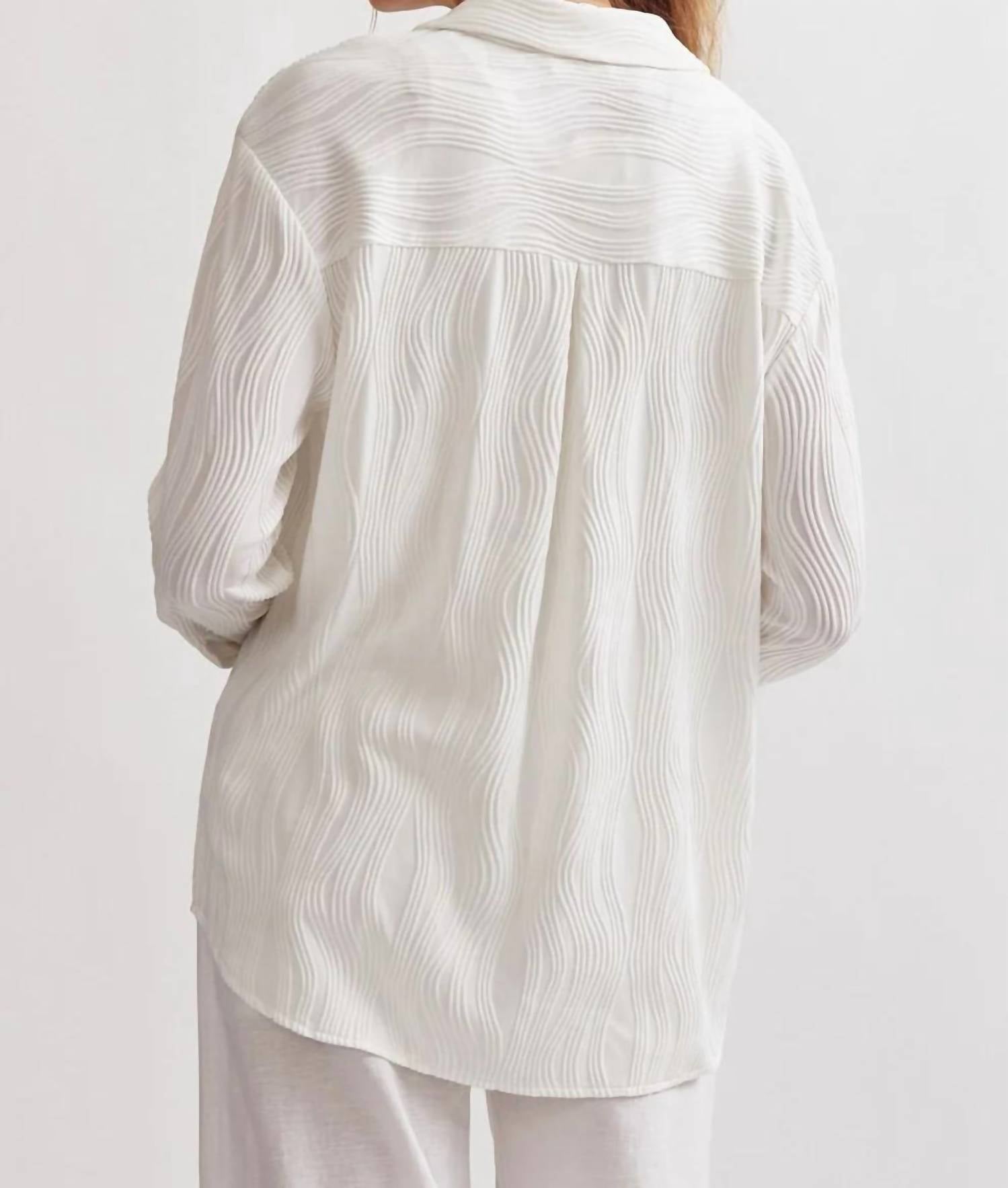 Perfectly tailored and soft to the touch. Chic addition to your minimalist travel wardrobe. Long sleeve button-up shirt in solid cream features a textured wave fabric paired with a classic collar, combining style with functionality. Made from 95% polyester and 5% spandex. Designed with pockets at the front for convenience. Care for this piece by hand washing it in cold water and hanging it to dry.