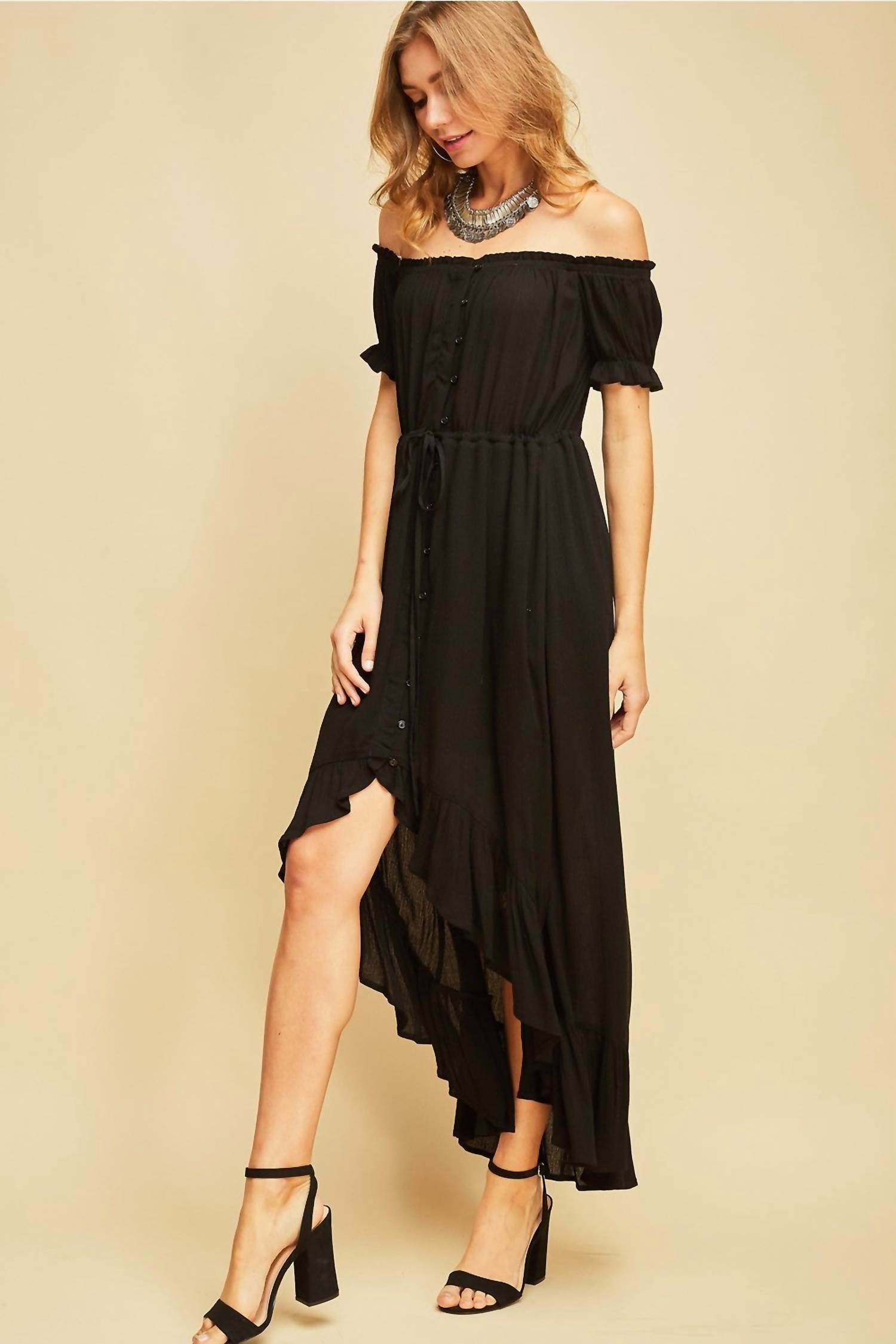 A cool twist on a classic style dress. It features an off-the-shoulder neckline, short sleeves, a button-down front, an adjustable drawstring at the waist, a high-low ruffled hem, is lightweight, and has an a-line maxi silhouette. Small bust 36", length 53". Medium bust 38", length 53". Large bust 40", length 53". 100% rayon. Hand wash or dry clean.