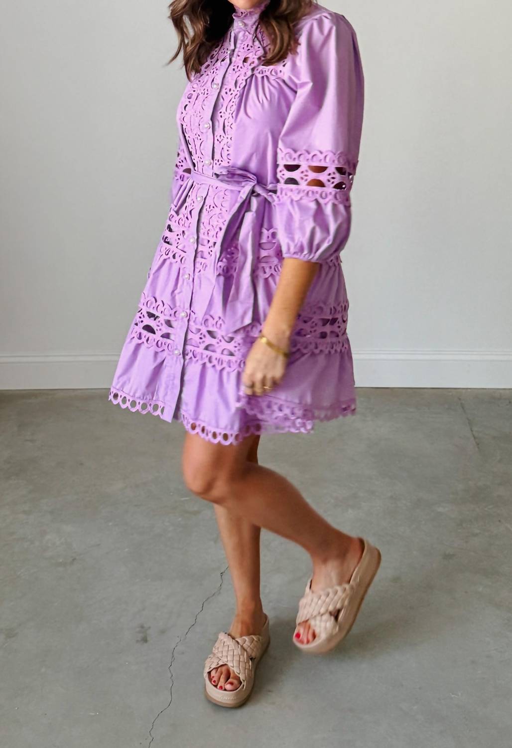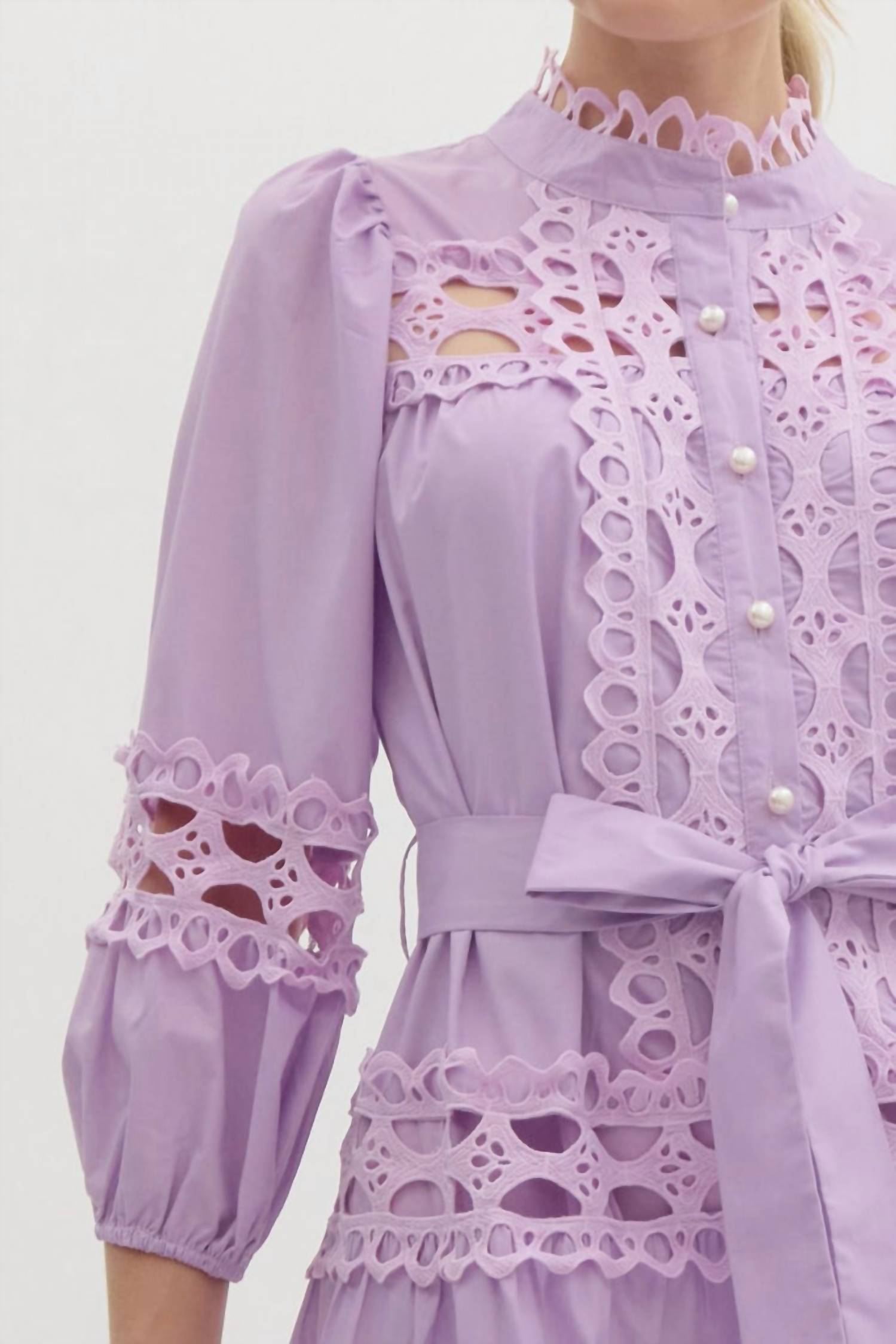 Introducing the Pearl & Lace Mini Dress by Entro, a charming addition to your spring wardrobe in a delightful lilac hue. This textured A-line dress features three-quarter sleeves and a sophisticated mockneck, elegantly adorned with pearl button closures and lace trim. Made from 100% cotton, it offers a flattering silhouette with its self-tie waist, ensuring both style and comfort. Care is simple with machine wash instructions, making it an effortlessly chic choice for occasions such as baby showers, embodying the boho chic trend.