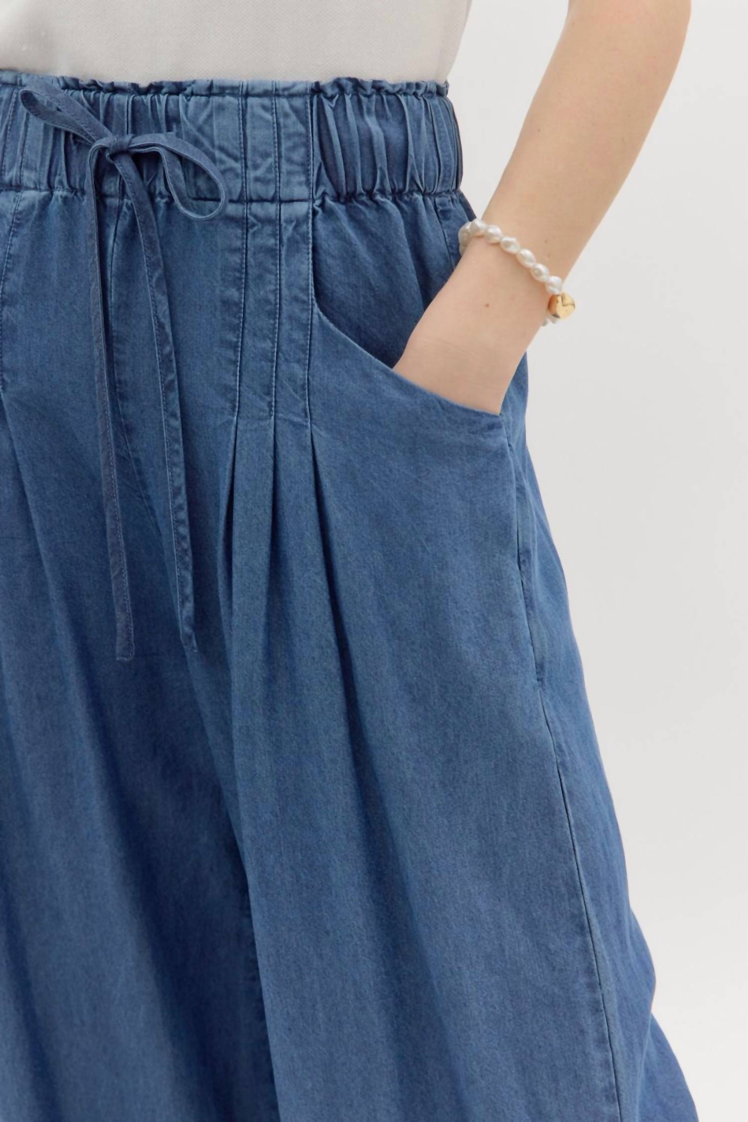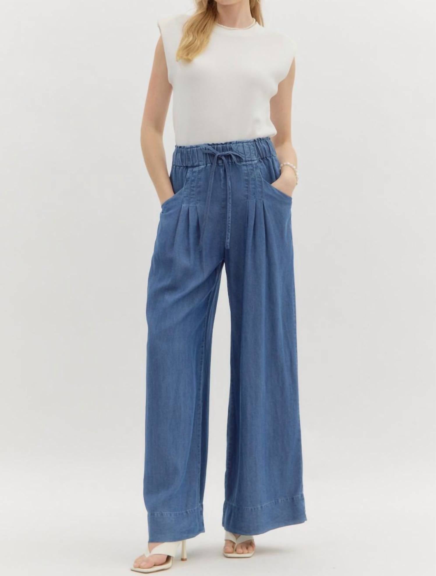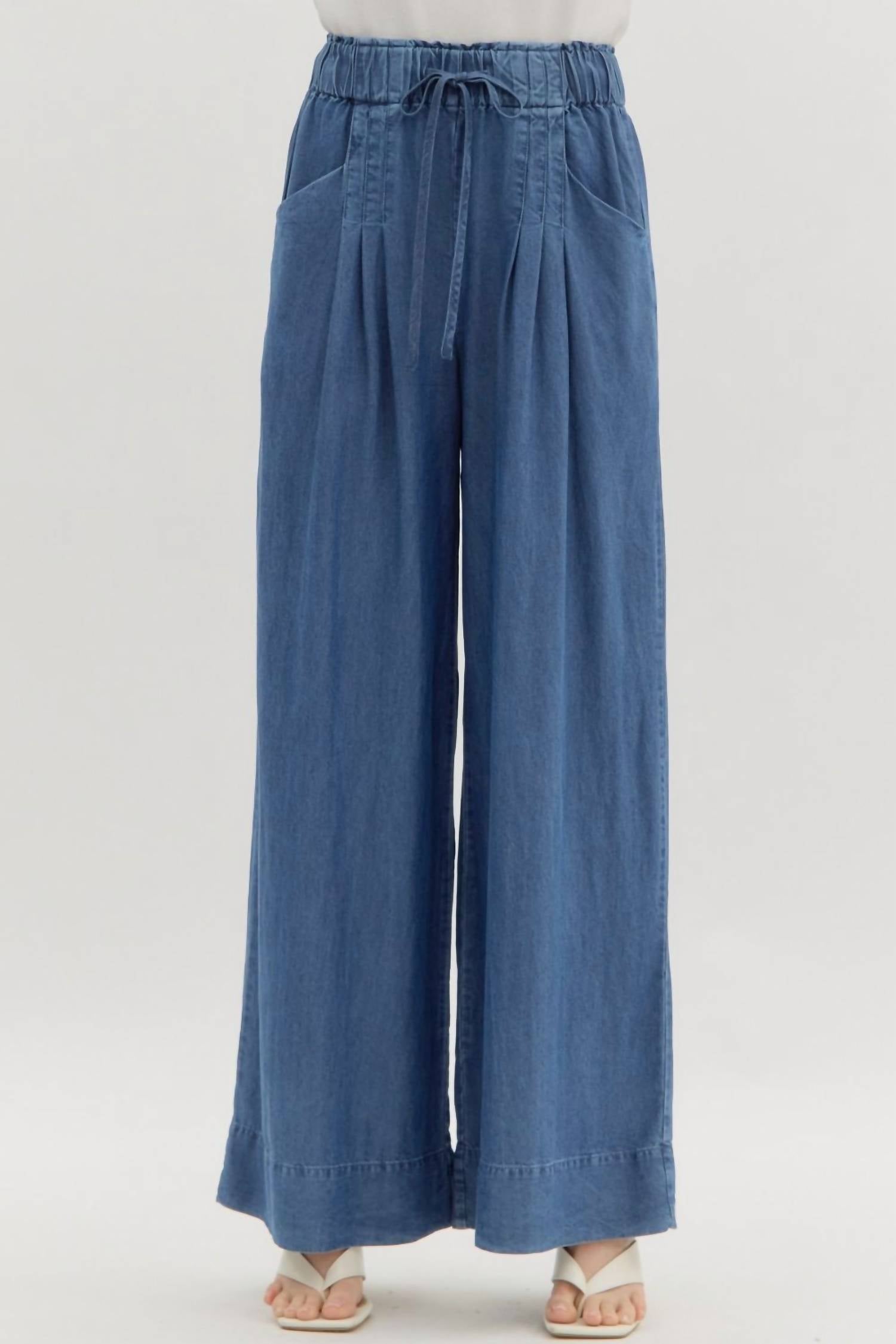 Elevate your wardrobe with the Pintuck Denim Wide Leg Pants by Entro, designed for a boho chic look in a classic blue hue. These high-rise pants, made from 100% Tencel Lyocell, feature a self-adjustable tie elasticated waistband for comfort. The pull-on closure and front slant pockets add practicality to the stylish slim fit and wide leg design. Perfect for any spring occasion, these pants are machine washable.
