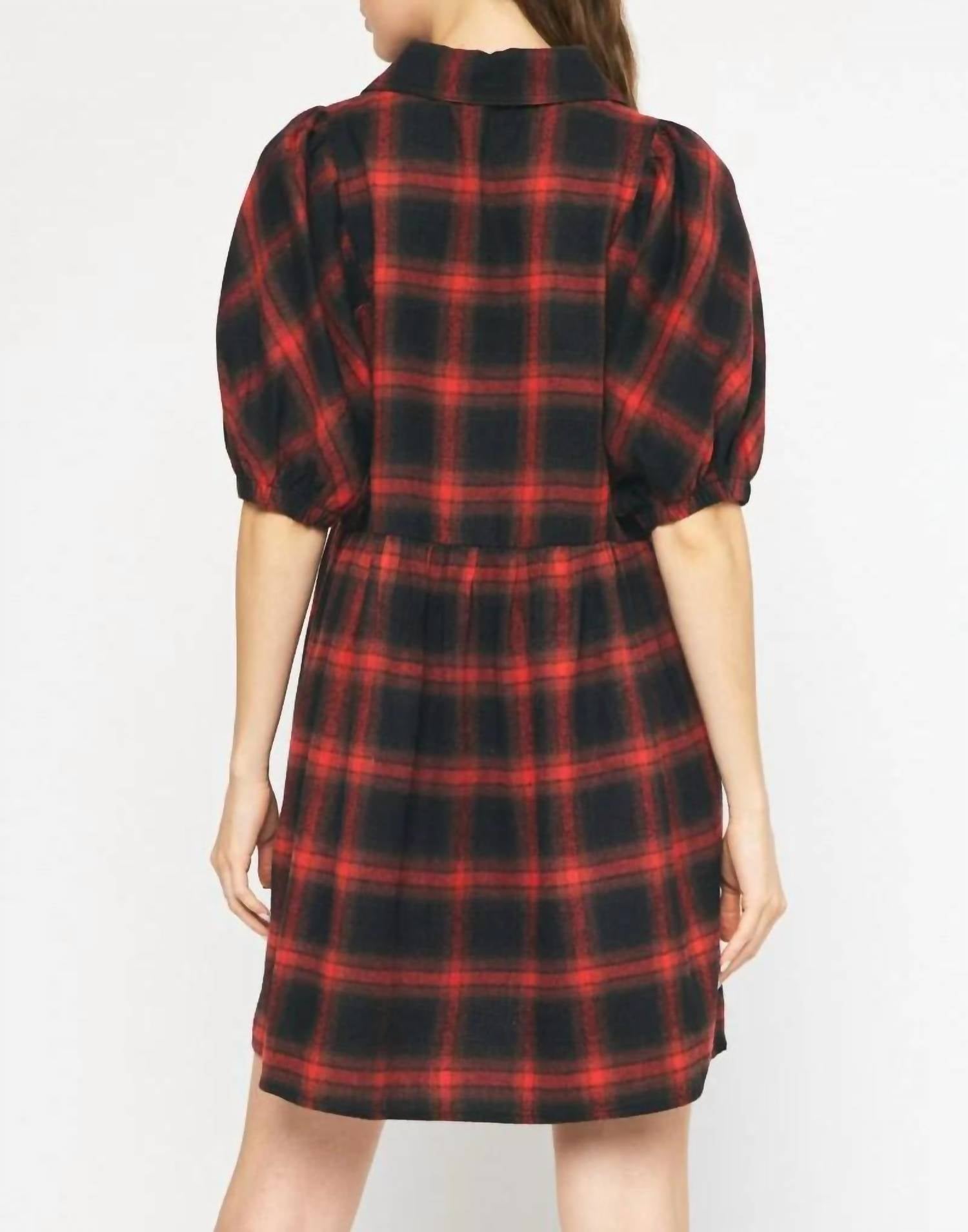 Step into summer style with the Plaid Puff Sleeve Dress by Entro, crafted for vacation-ready flair. This A-line mini features elbow sleeves in a chic red and black plaid pattern. With a button closure and classic collar neckline, it's a timeless piece for your wardrobe. Care instructions are to hand wash and line dry, ensuring the dress stays as vibrant as your summer adventures.