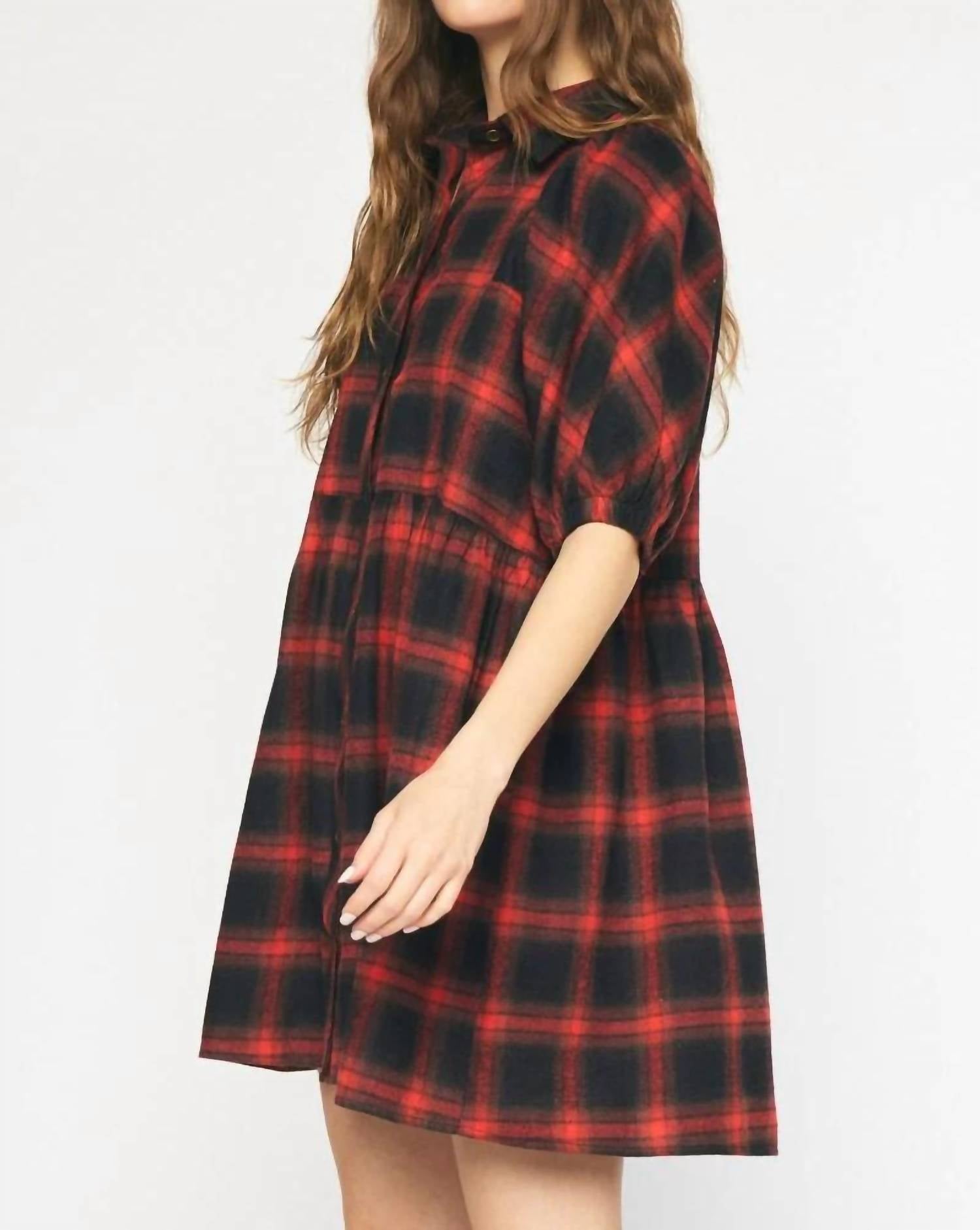 A short and breezy dress for those warmer days. Step into summer style with the Plaid Puff Sleeve Dress by Entro, crafted for vacation-ready flair. This A-line mini features elbow sleeves in a chic red and black plaid pattern. With a button closure and classic collar neckline, it's a timeless piece for your wardrobe. Care instructions are to hand wash and line dry, ensuring the dress stays as vibrant as your summer adventures.