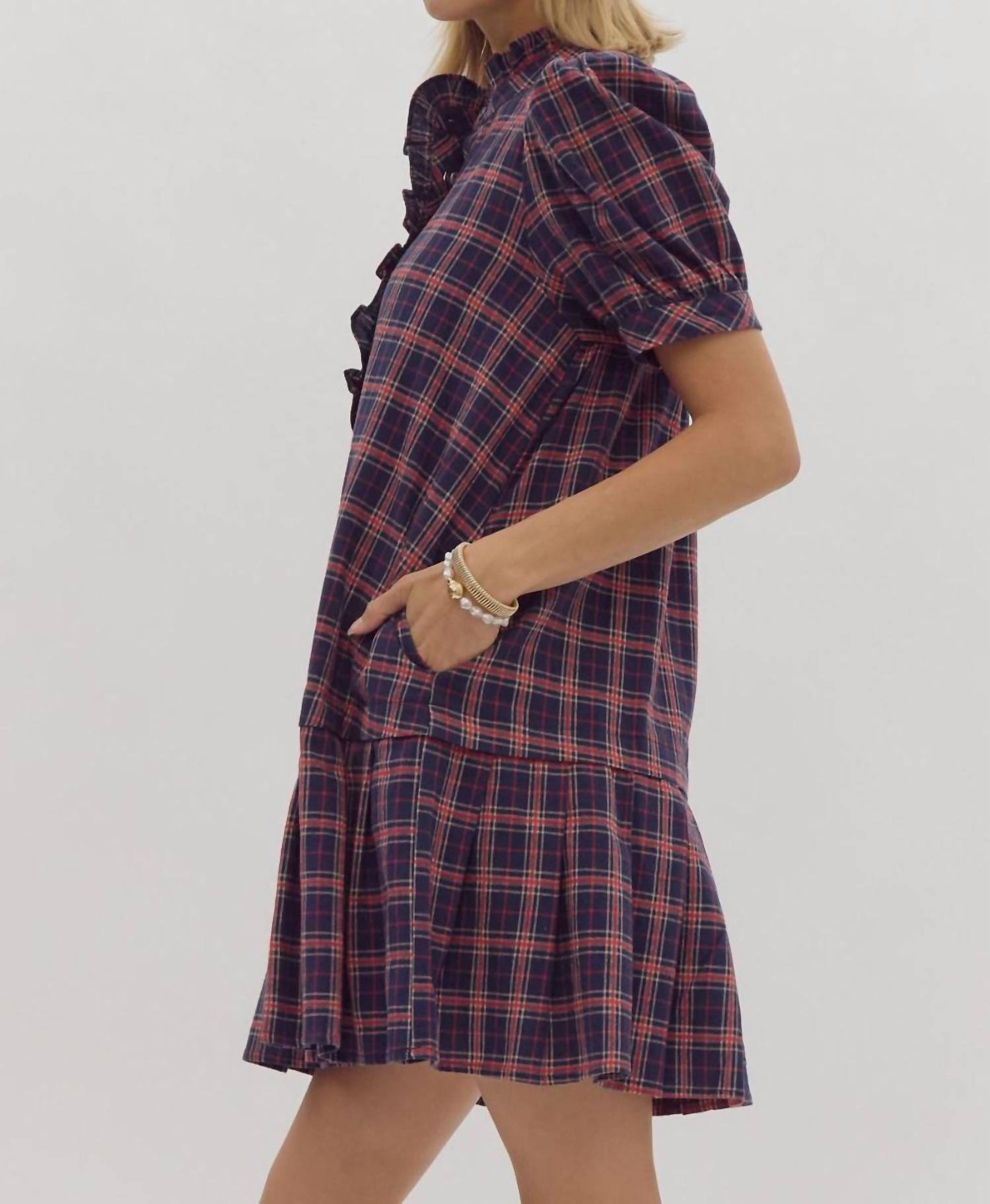 A short and breezy dress for those warmer days. Introducing the Plaid To Meet You Dress by Entro, a chic mini dress in a vibrant blue and red plaid print. This lightweight, woven dress features short sleeves, a stylish mockneck with ruffled trim, and a pleated hem for added flair. Crafted from 100% cotton, it includes a practical button-up detail at the bust and pockets for convenience. Model is 5'10" and wearing a size small.