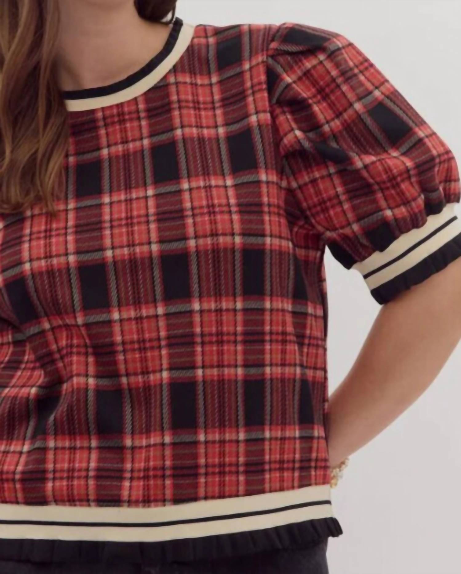 A versatile blouse that works from desk to dinner! Elevate your wardrobe with the Plaid Top by entro, a stylish addition to any ensemble. This red short puff sleeve pullover features a charming crewneck design, adorned with ruffled-edged two-tone stripe rib band for a playful touch. Made in a lightweight non-sheer knit, this piece offers comfort without compromising on style. Closure is a convenient pull-on, making it a versatile piece for everyday wear.