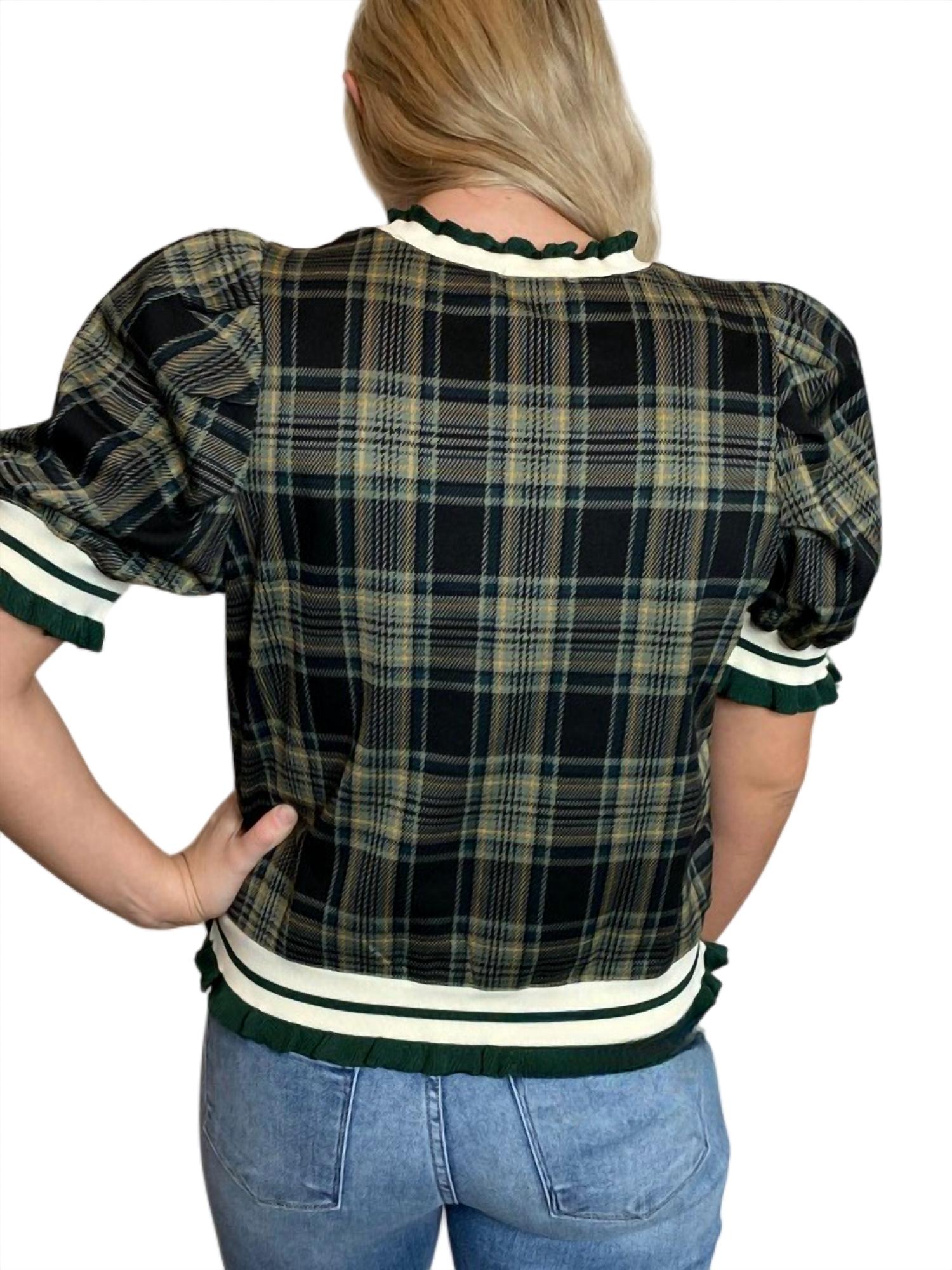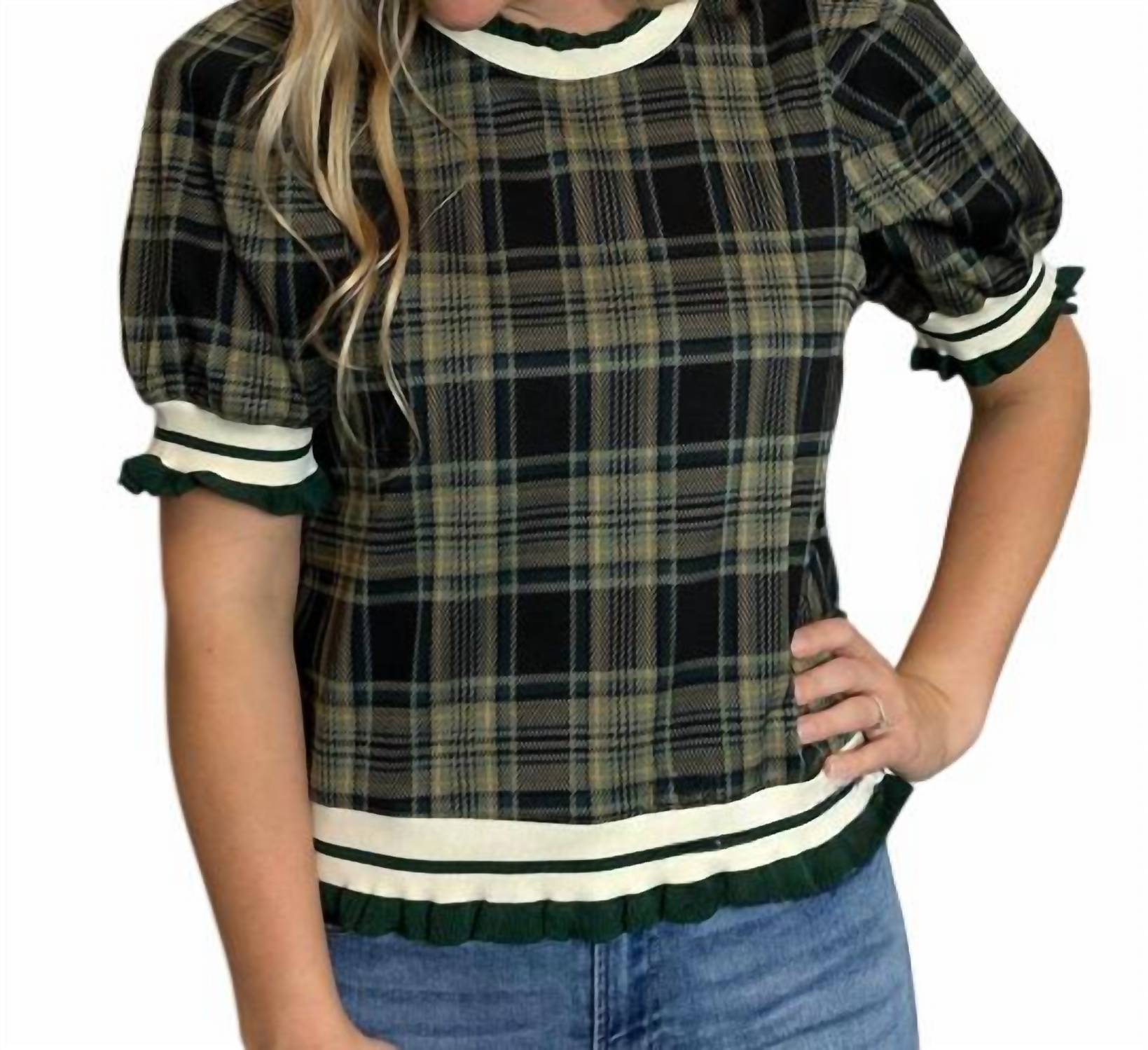 Elevate your wardrobe with the Plaid Top by entro, a stylish addition to any ensemble. This red short puff sleeve pullover features a charming crewneck design, adorned with ruffled-edged two-tone stripe rib band for a playful touch. Made in a lightweight non-sheer knit, this piece offers comfort without compromising on style. Closure is a convenient pull-on, making it a versatile piece for everyday wear.