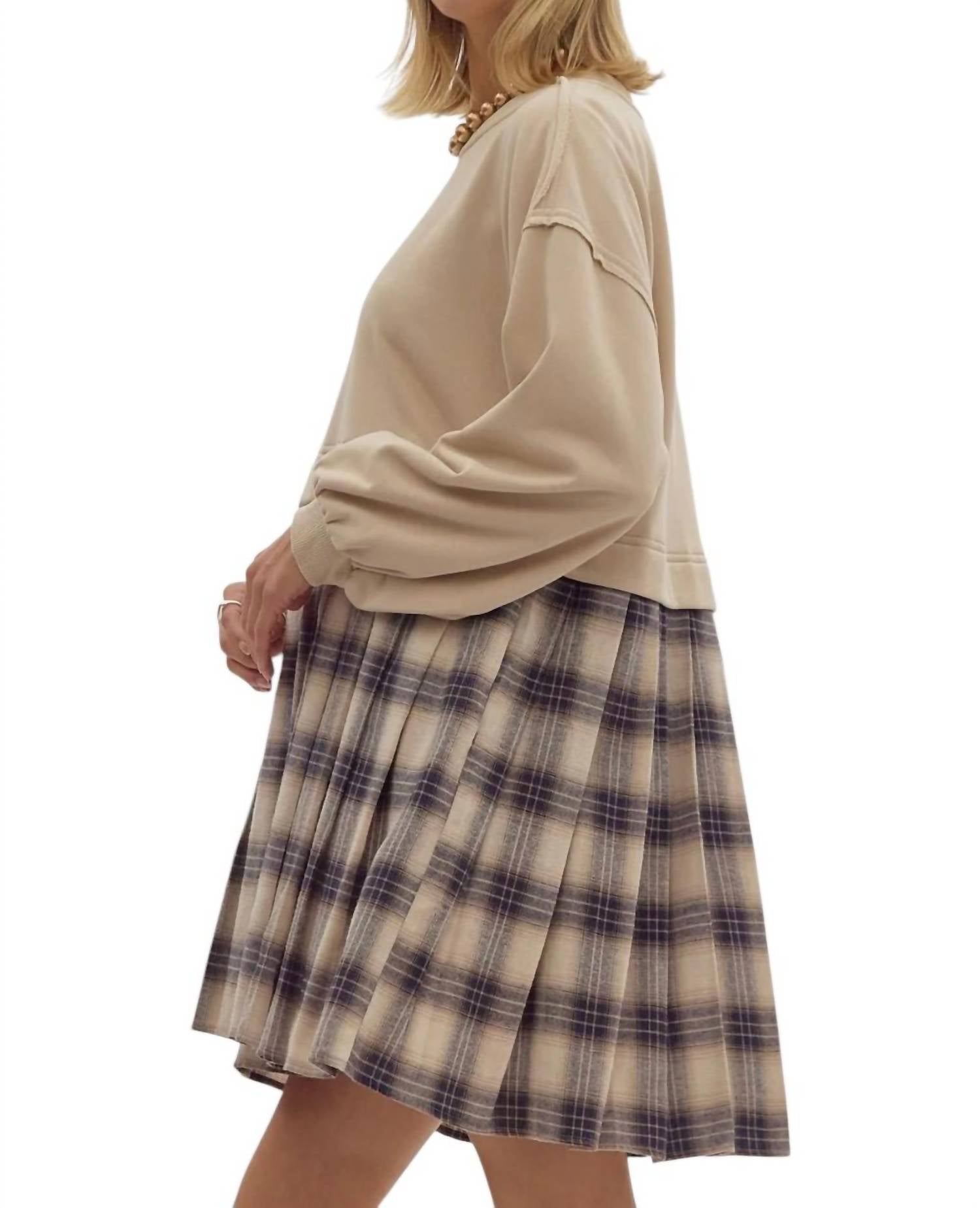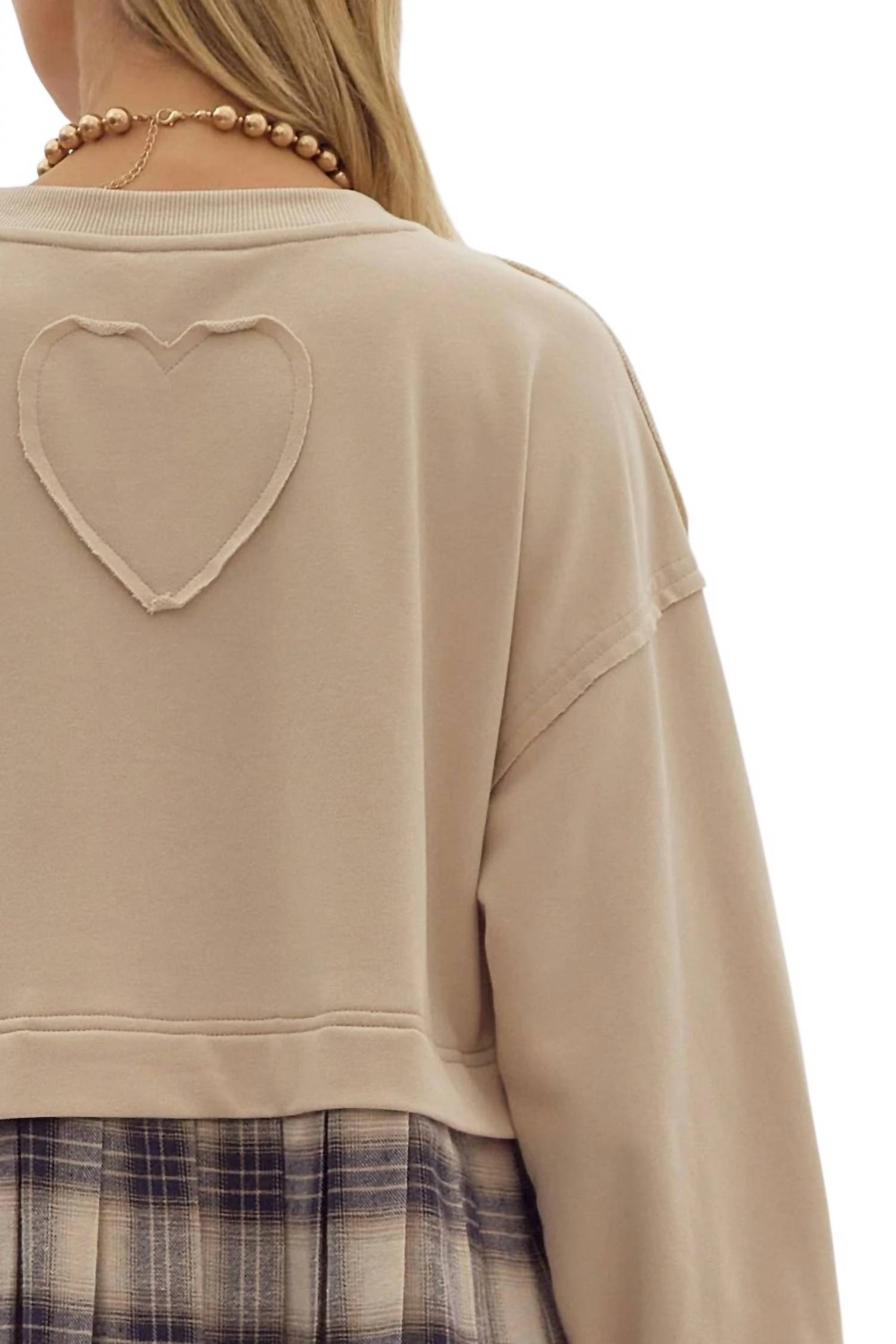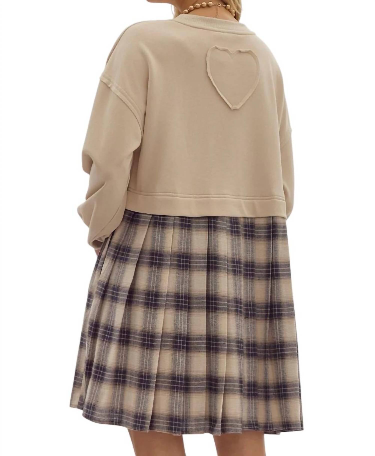 This long sleeve mini dress features a plaid skirt and a heart detail at the back. It is designed with pockets and has a pull-on style. Unlined. Made from 53% cotton and 47% polyester.