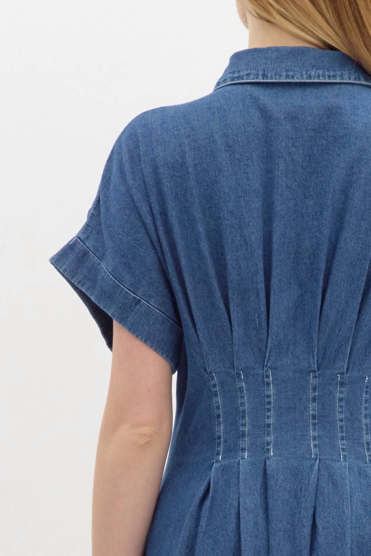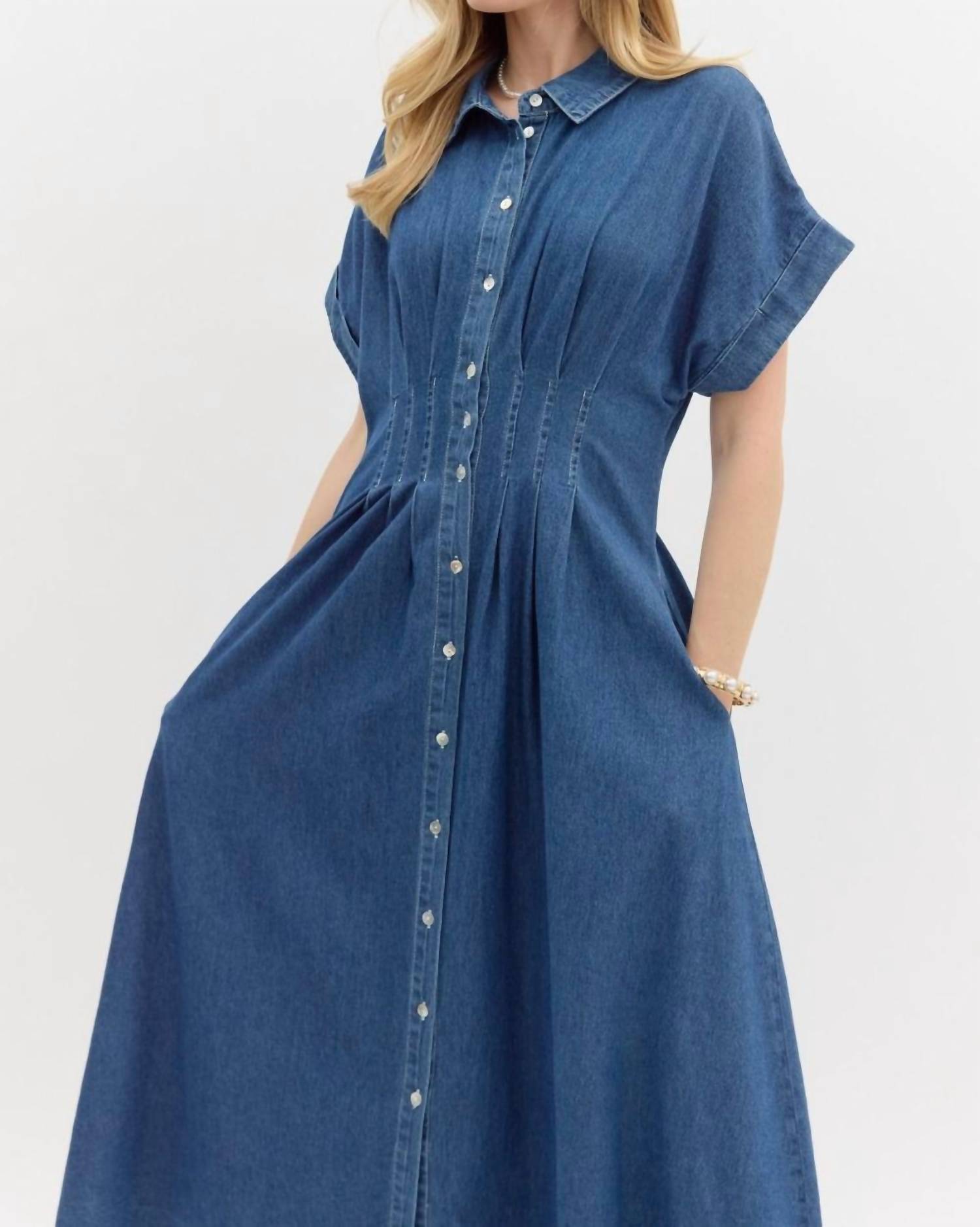 Introducing the Pleated Maxi Dress by Entro, a statement piece in denim with a solid pattern perfect for adding a touch of sophistication to any wardrobe. This playful A-line dress features short sleeves and a flowy silhouette that suits any occasion, from New Year's Eve to a casual day out. Crafted from a 100% cotton blend, it boasts a collar neckline and convenient button closure with functional pockets. Care instructions include machine washing for easy maintenance. Model is 5'10" and wearing a size small.